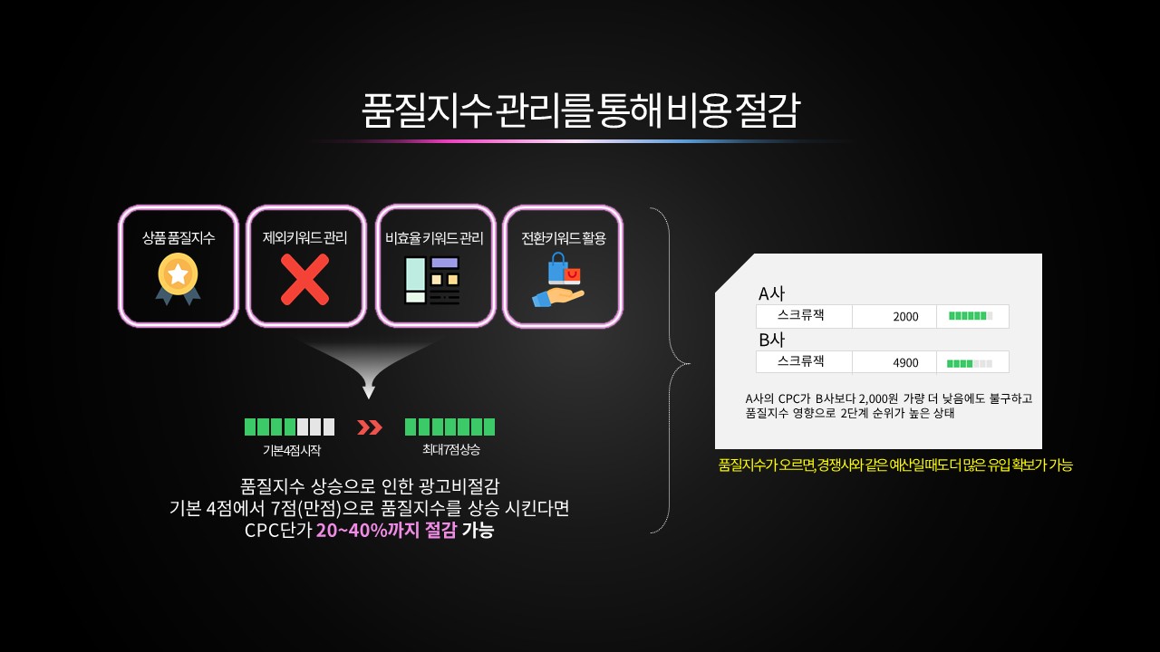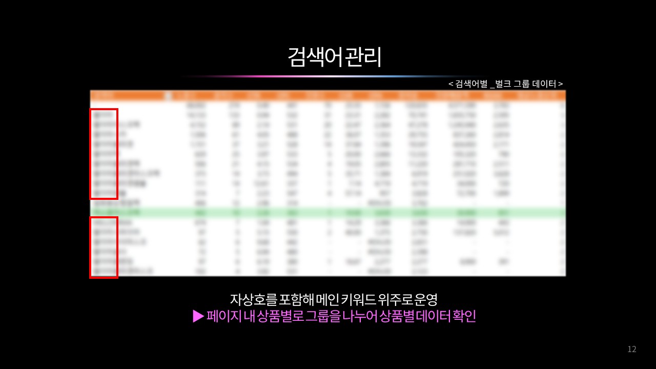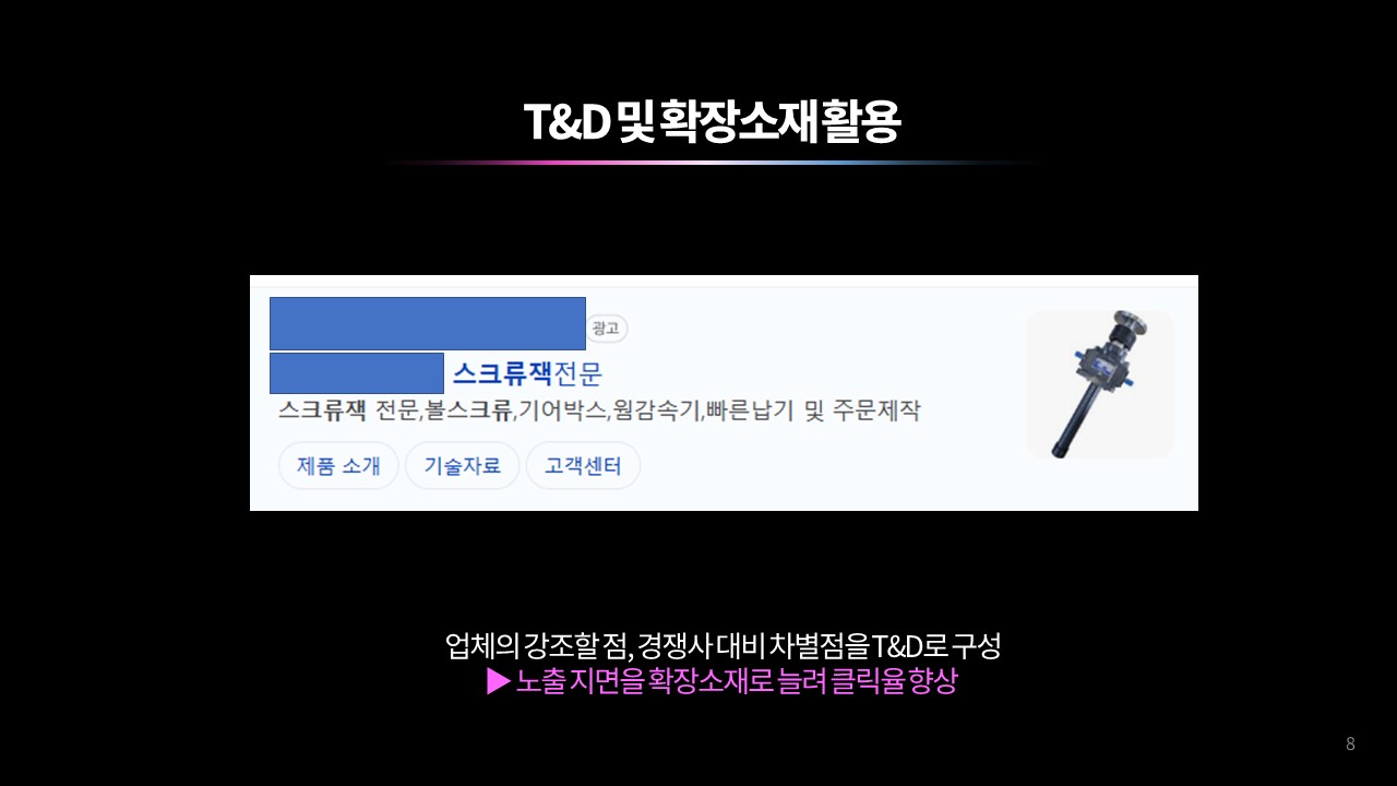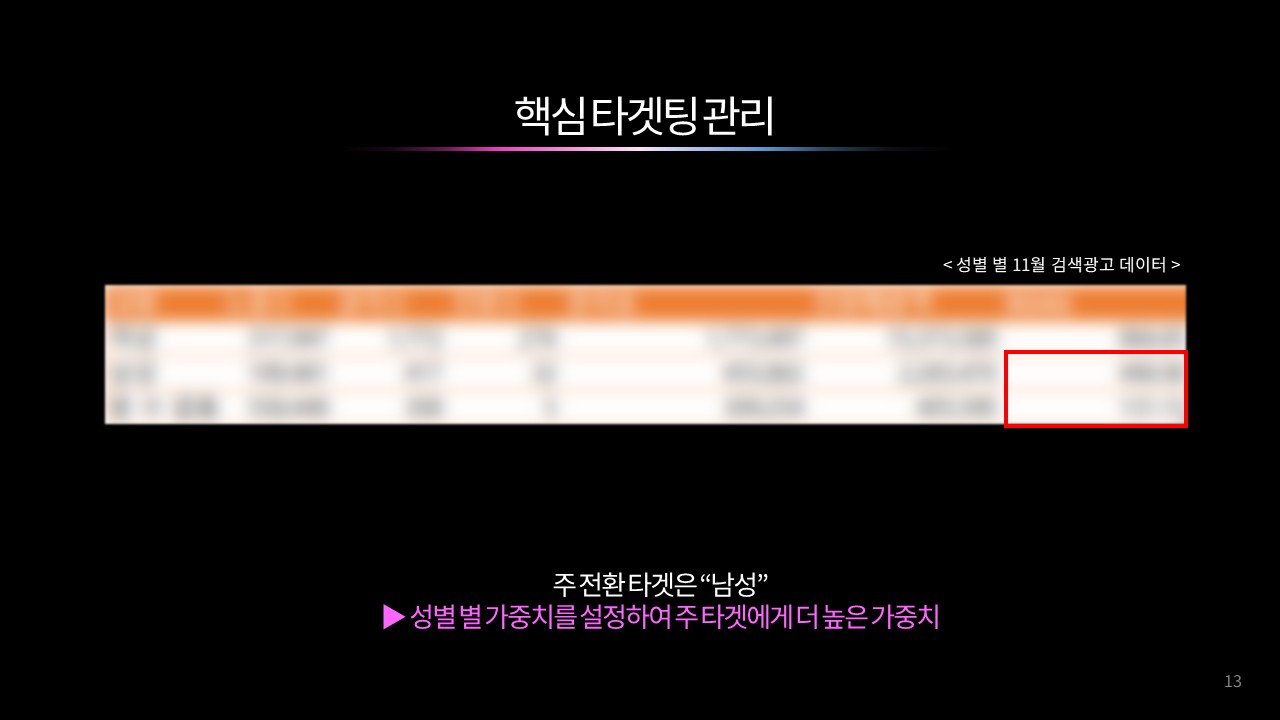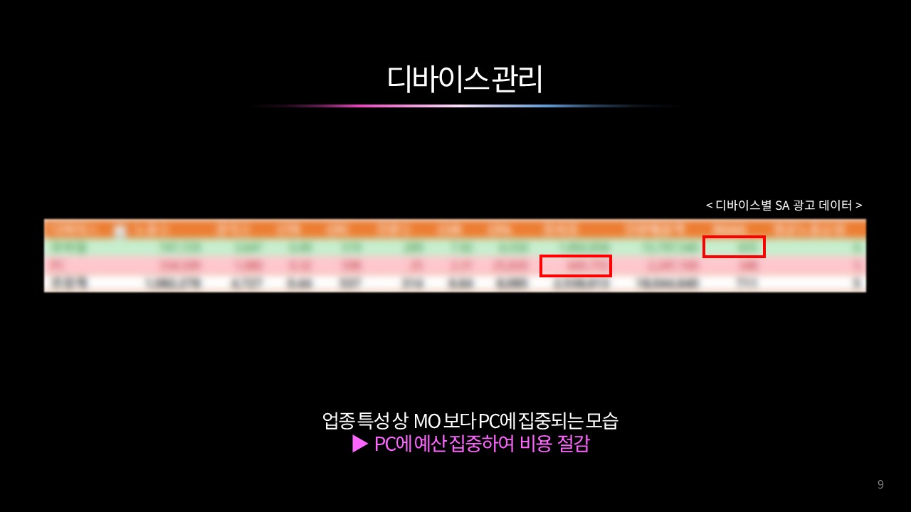 자상호, 메인, 서브 키워드를 명확히 분리해 브랜드 검색 유입은 안정적으로 확보하고, 비브랜드 키워드는 확장 관점에서 운영한다. 이후 사이트 내 주요 카테고리 구조를 기준으로 키워드를 그룹핑해 검색 의도에 맞는 메인·서브 키워드를 설정함으로써 캠페인과 광고그룹의 구조적 효율을 높인다. 또한 PC와 모바일의 노출 및 전환 성과 차이를 분석해 상순위 구간 입찰가를 매체별로 조정하고, 성과가 좋은 디바이스에 예산을 집중해 광고 효율을 극대화한다.