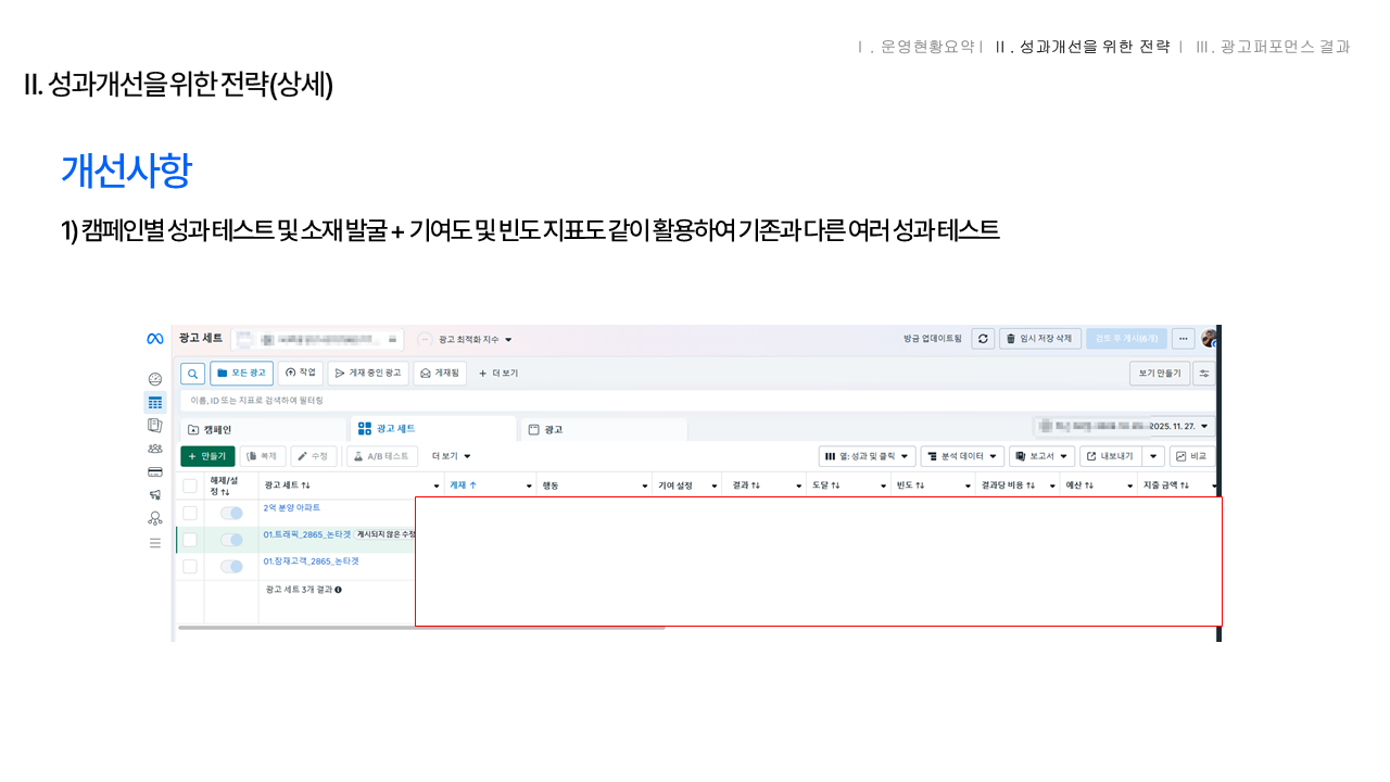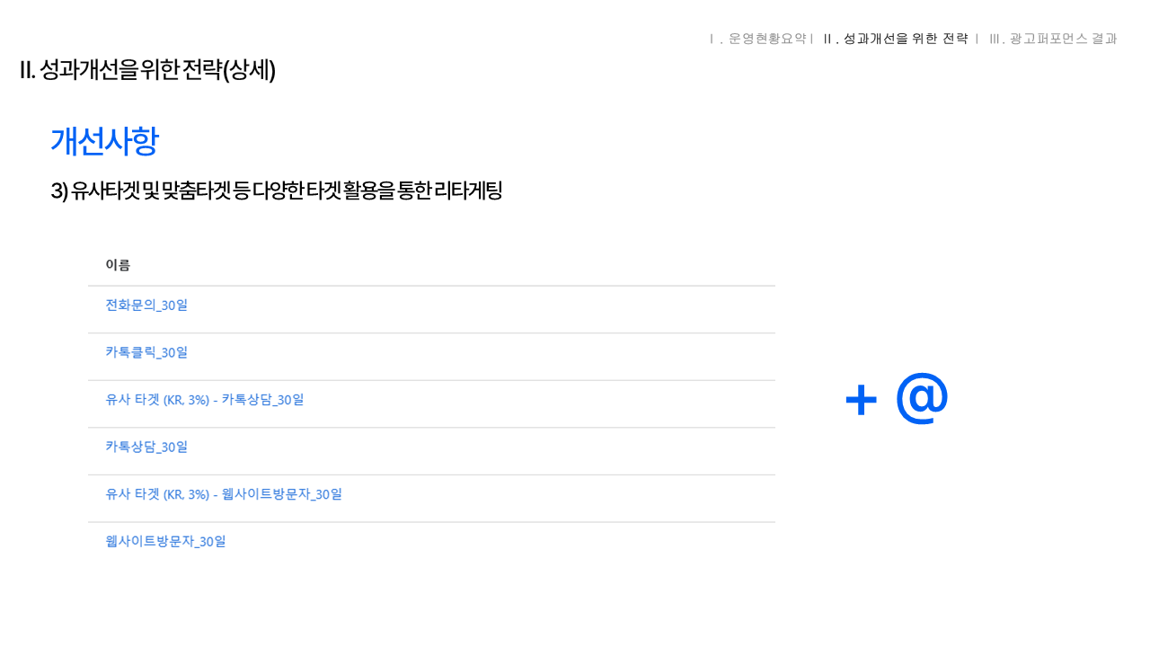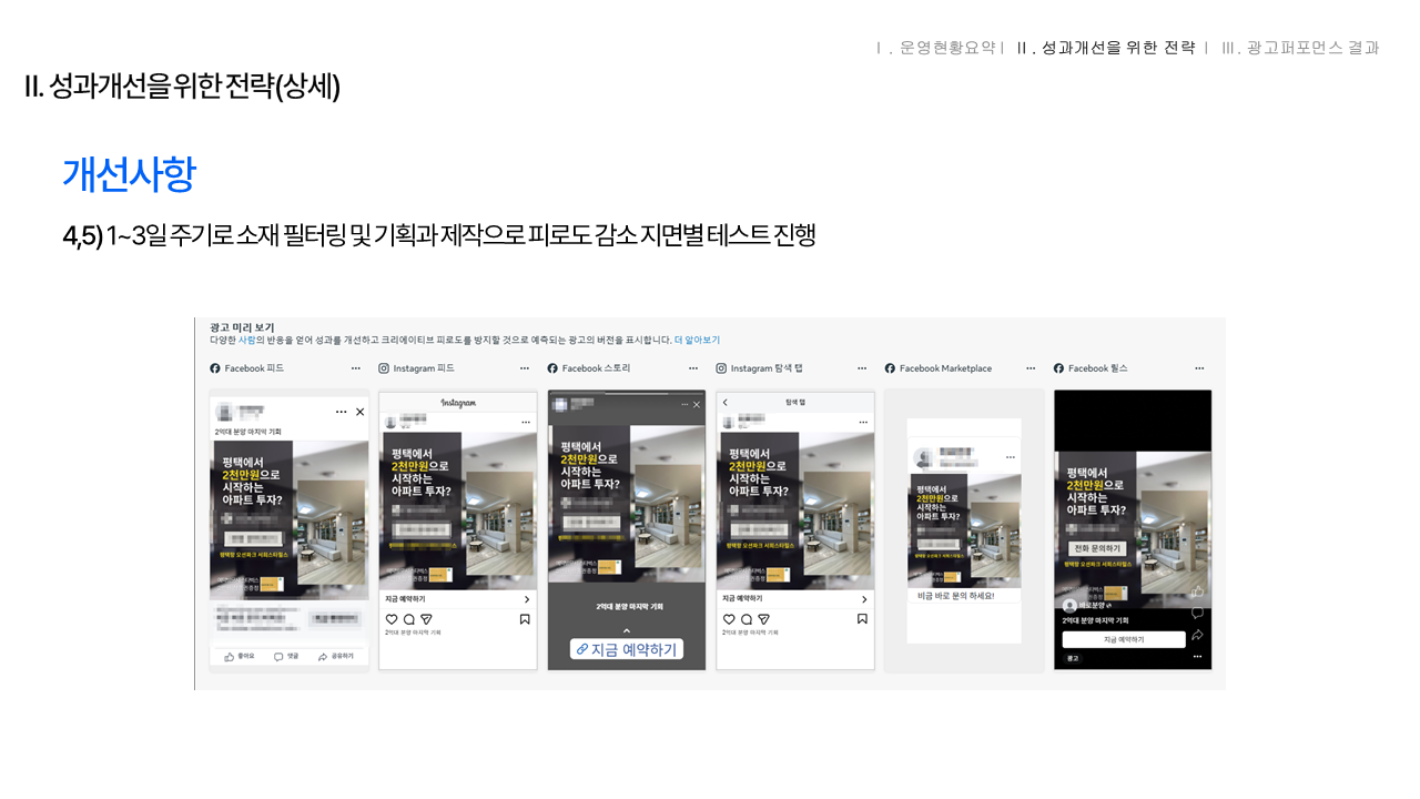 1. 전환/트래픽/잠재고객 등 다양한 캠페인 활용하여 테스트 진행하였고 타겟팅, 지면, 연령별로 그룹 분리하여 유효 DB증대