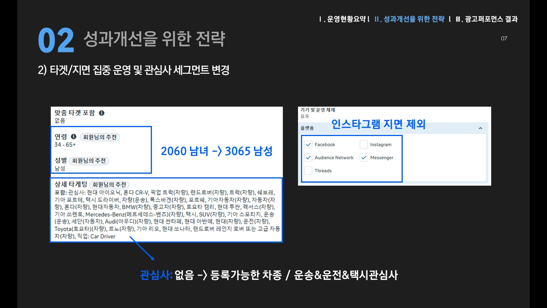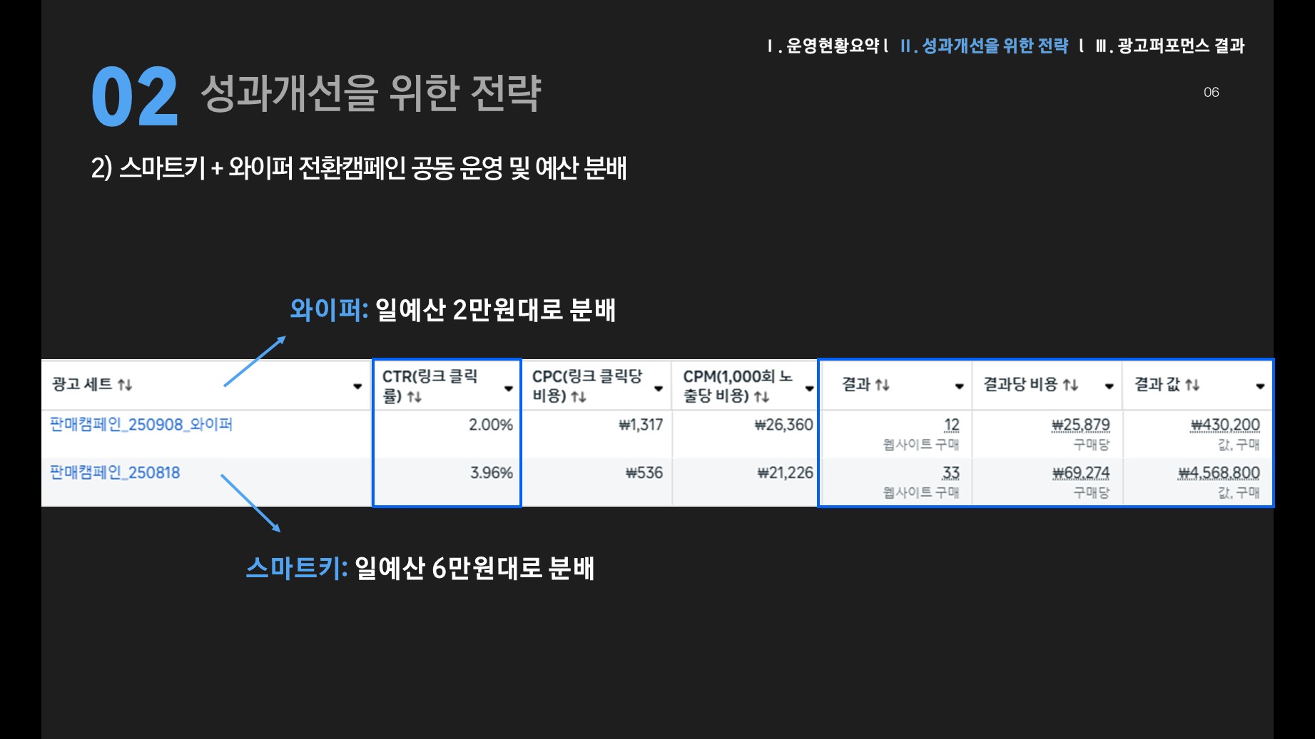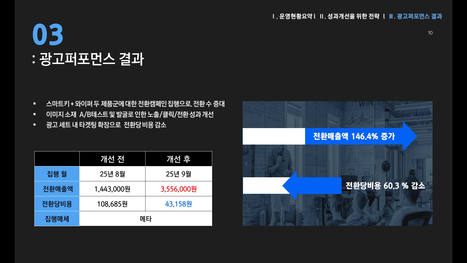 개요 네이버/메타/구글 중 메타 매체에서 전환율 증대 및 전환당 비용 감소, 브랜딩 및 전환 성과 증대