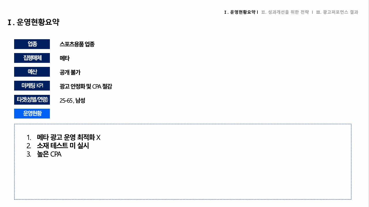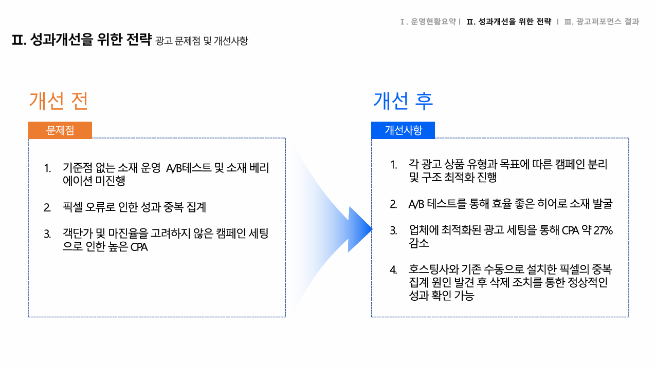 1. 기준점 없는 소재 운영 -> A/B 테스트 및 소재 베리에이션 미진행