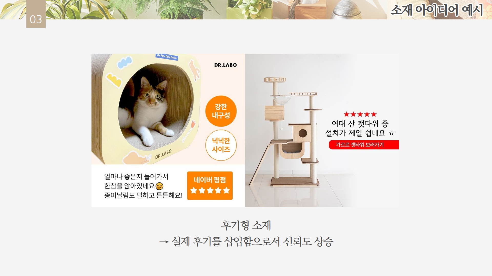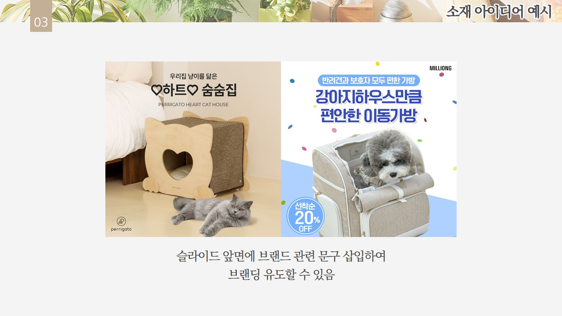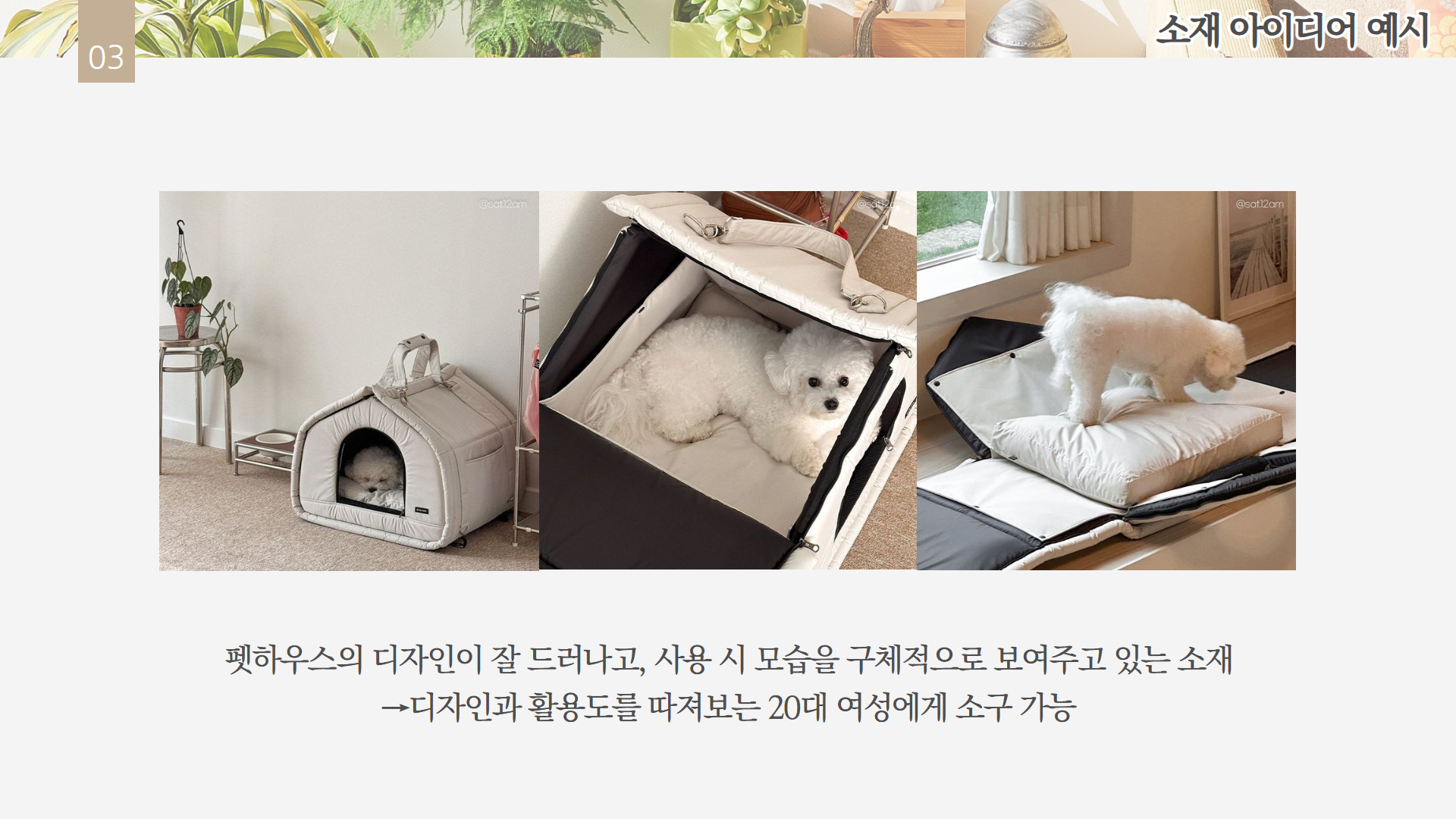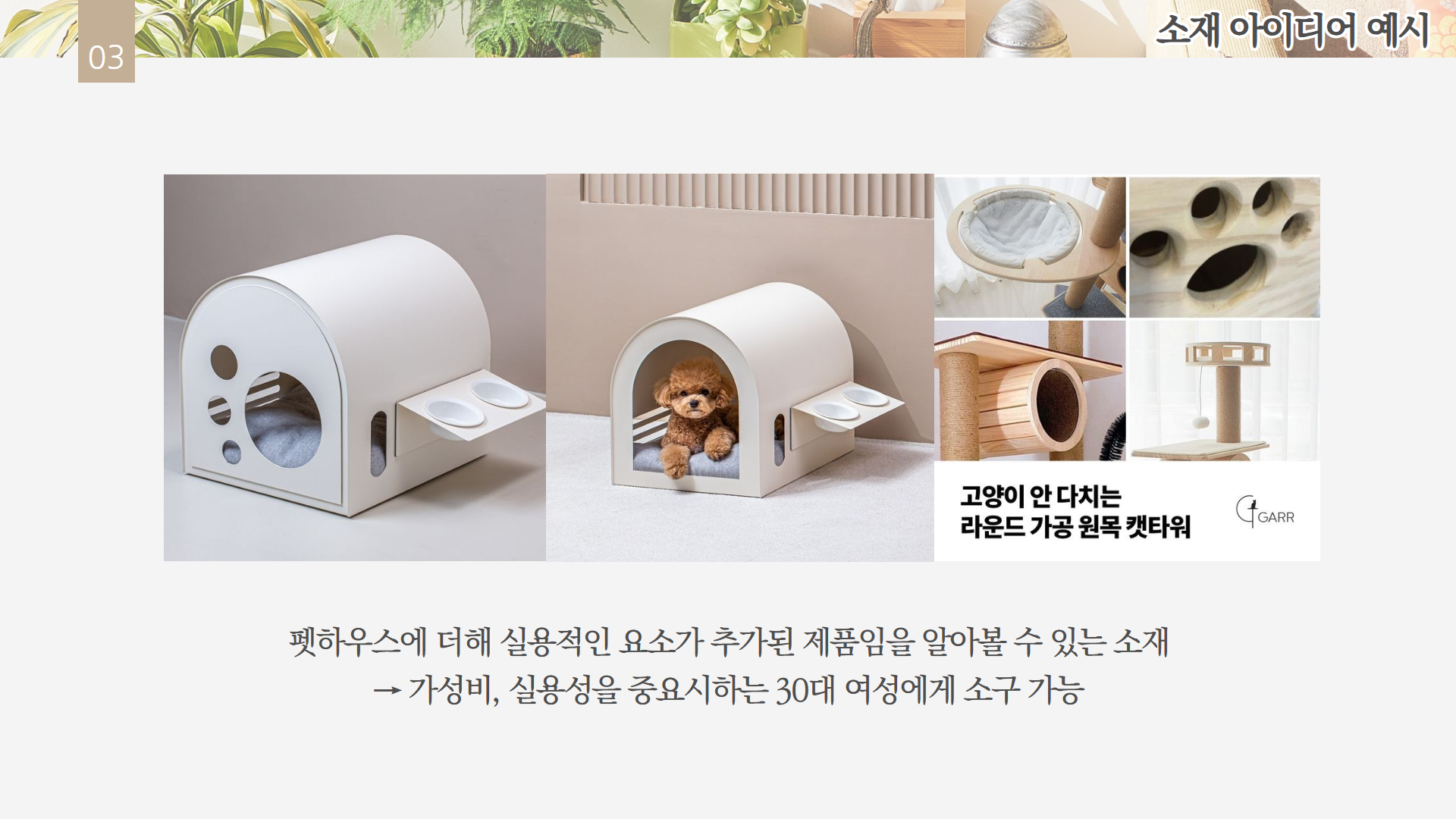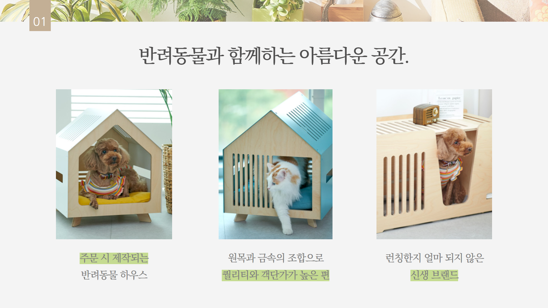펫하우스의 디자인이 잘 드러나고, 사용 시 모습을 구체적으로 보여주고 있는 소재 사용