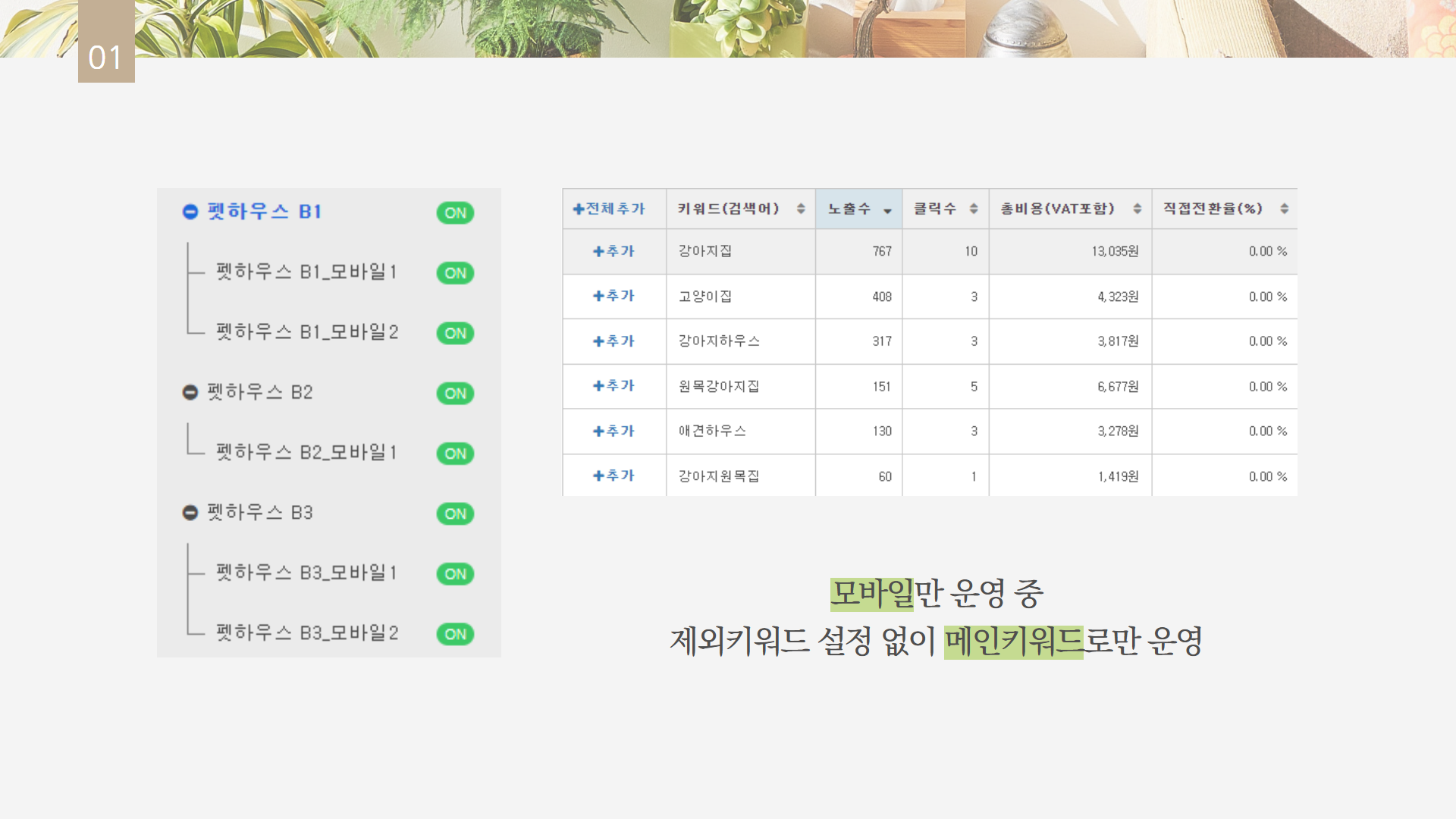 모바일만 운영 중이고 제외키워드 설정 없이 메인키워드로만 운영