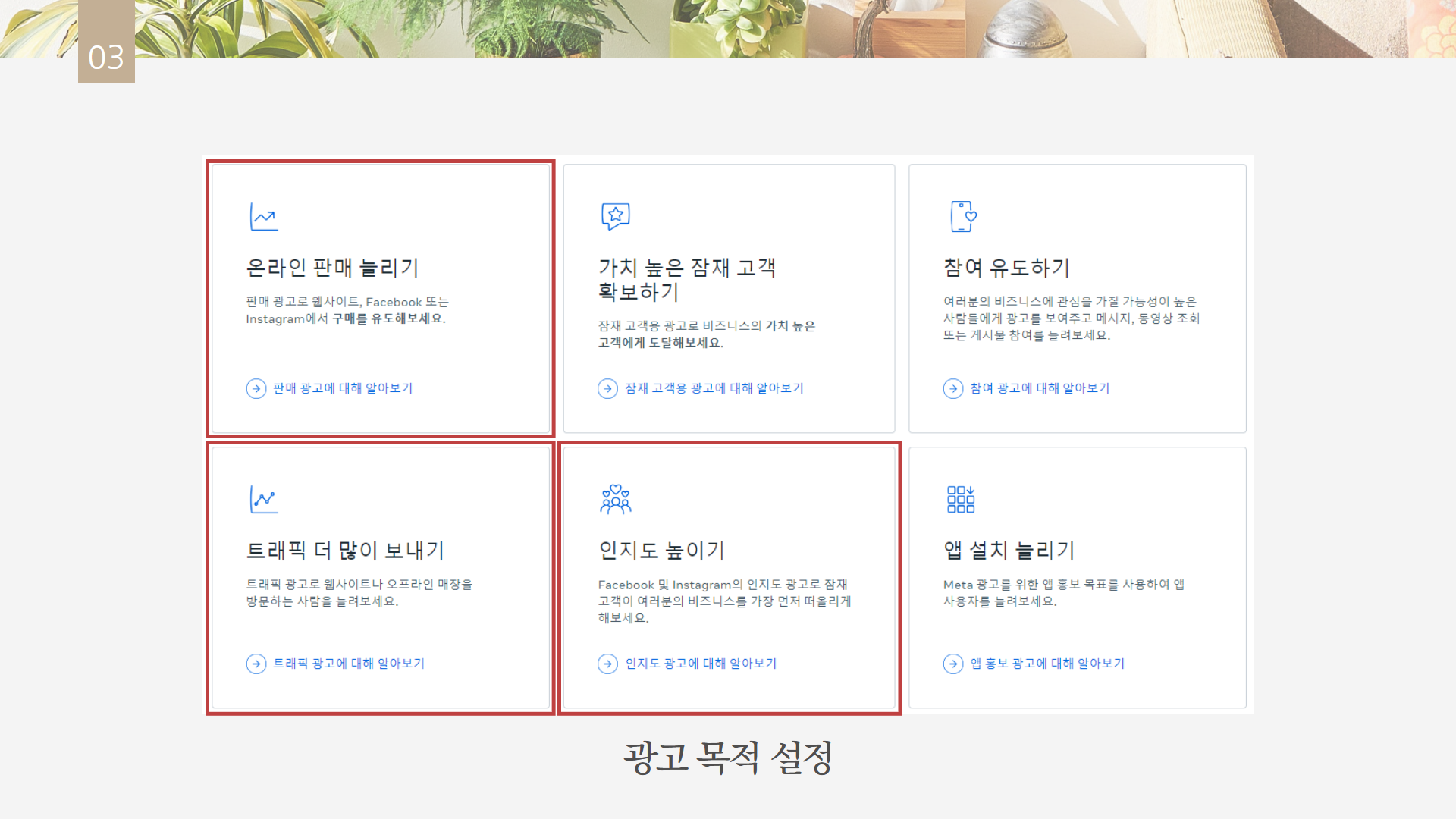 광고 목적을 판매 늘리기, 트래픽 더 많이 보내기, 인지도 높이기 로 설정