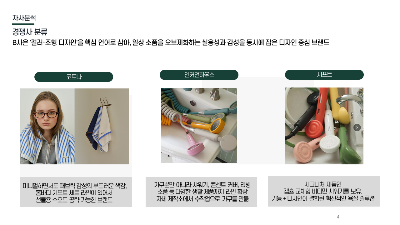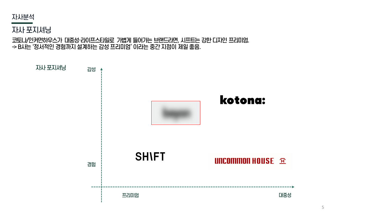 경쟁사 비교 대중성 브랜드(코토나·인커먼)와 프리미엄 브랜드(시프트)의 중간 지점 / 감성 프리미엄 영역이 최적