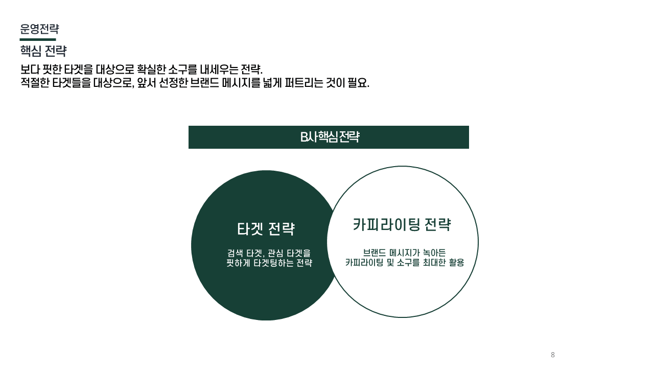 핵심 전략 방향성 넓은 타겟이 아닌 뚜렷한 니즈 타겟 먼저 선점 / 브랜드 감성 메시지 확산 / META + 네이버 검색 중심 퍼포먼스 구조