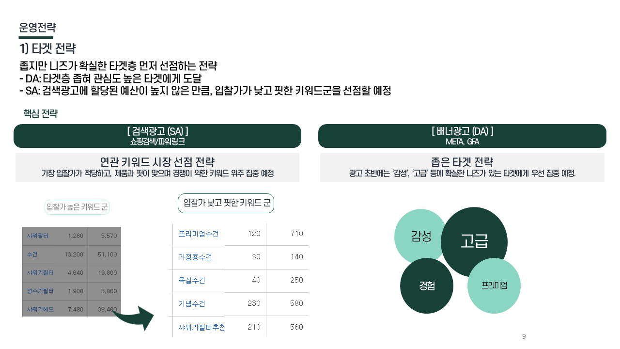 타겟 전략 DA: 관심도 높은 타겟 집중 도달 / SA: 낮은 입찰가 기반 핵심 키워드 선점 및 전환 극대화