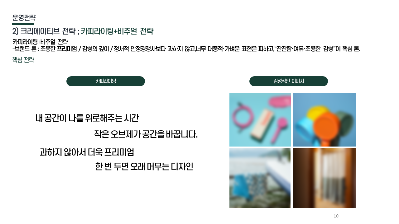 크리에이티브 톤 조용한 프리미엄 / 감성 깊이 / 정서적 안정 / 과한 표현 피함