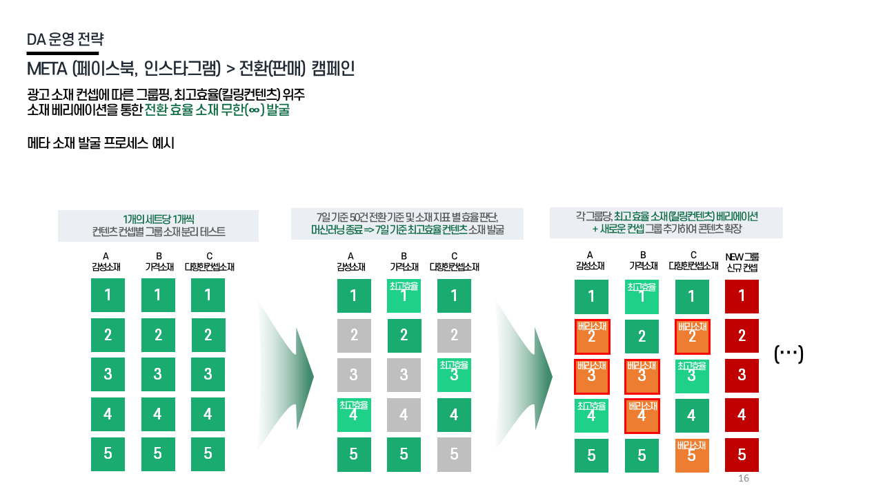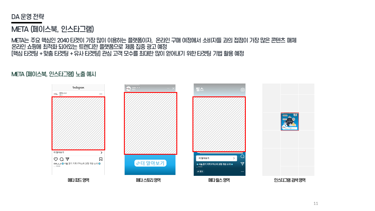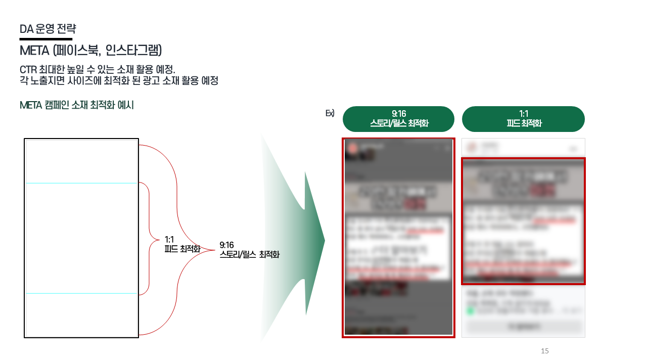 DA 전략 - 소재 최적화 CTR·ROAS 기준 고효율 소재 추출 / 고효율 소재 기반 변형 반복 / 9:16·1:1 지면별 최적화