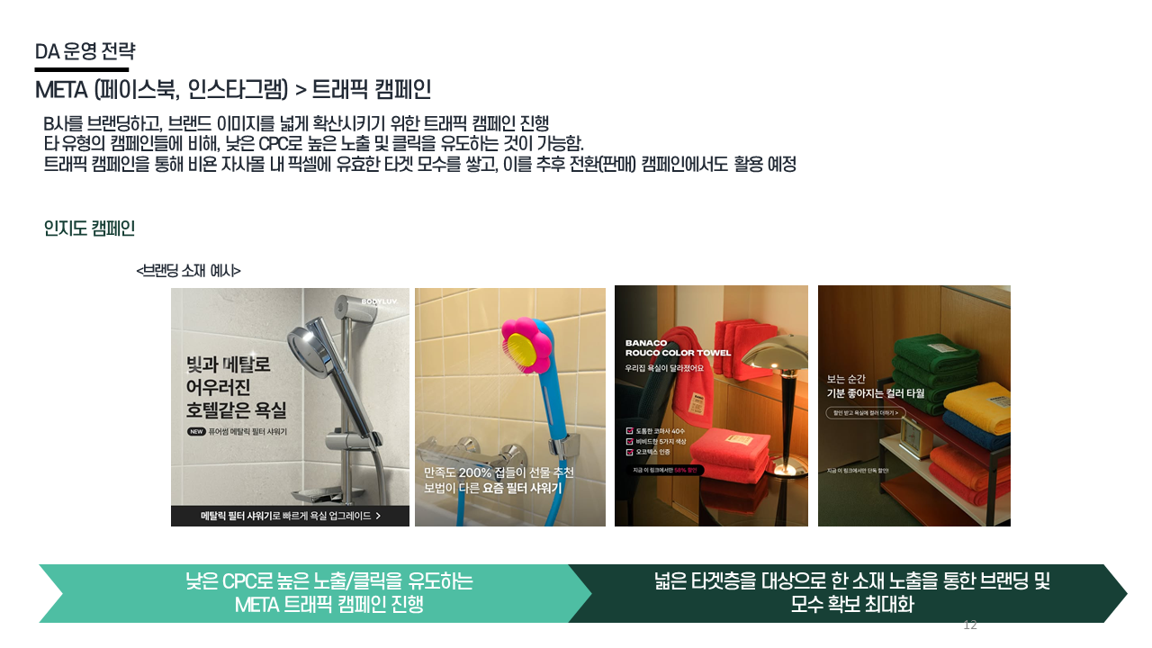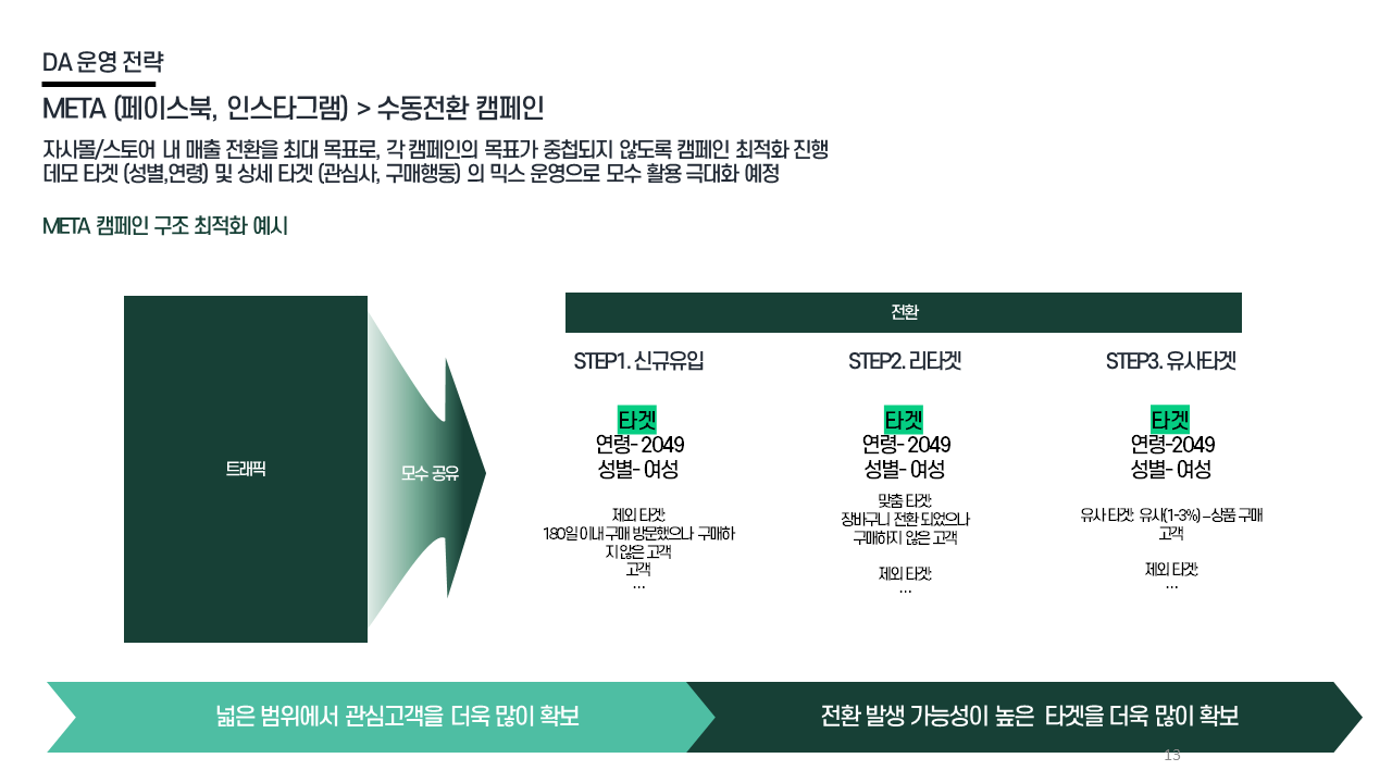 DA 전략 - 트래픽 캠페인 낮은 CPC 기반 대규모 유효 타겟 유입 확보 / 픽셀 기반 데이터 축적 후 전환 캠페인 활용