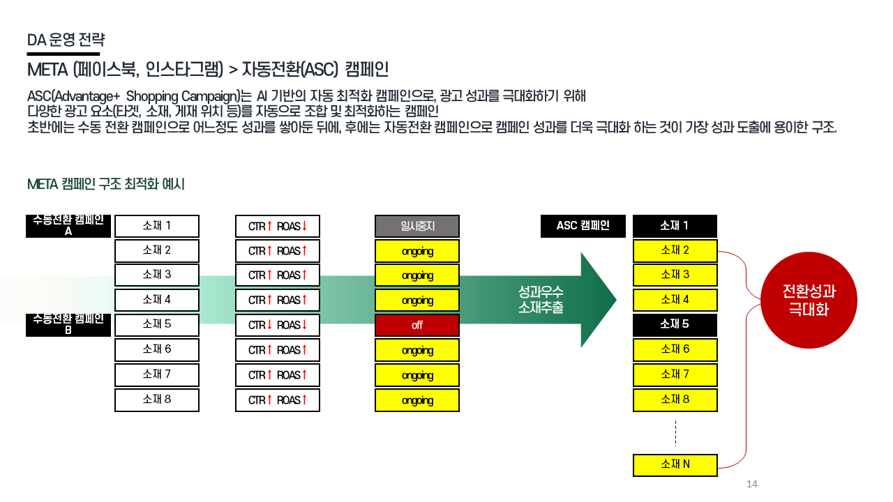 DA 전략 - ASC 자동전환 수동 캠페인 성과 축적 후 자동화 / 소재·게재위치·타겟 조합 최적화 / 전환 효율 극대화