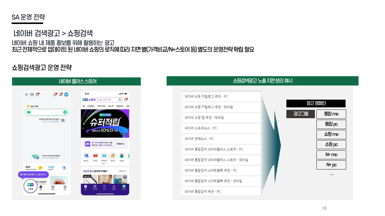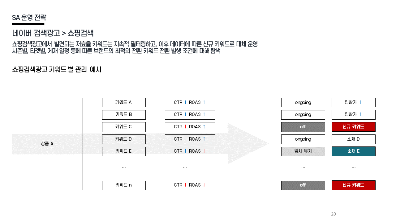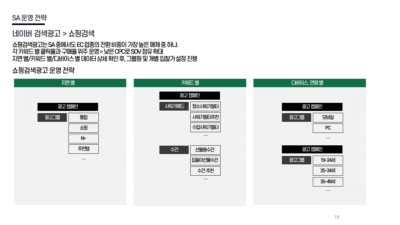 SA 전략 - 쇼핑검색 클릭률+구매율 중심 운영 / 저효율 키워드 필터링 / 신규 키워드 대체 / 세부 지면·디바이스 기반 최적화