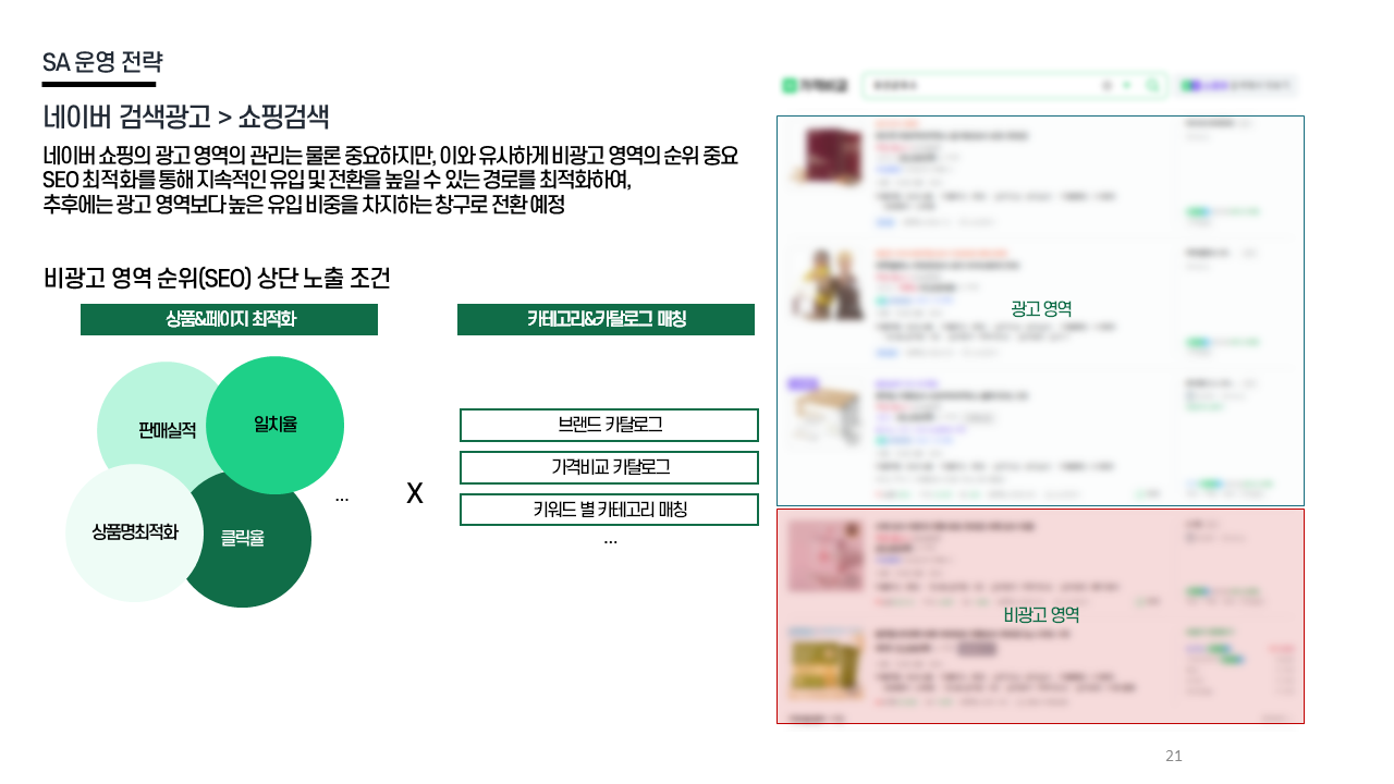 SA 전략 - SEO 상품명 최적화 / 카테고리·카탈로그 매칭 / 클릭률·판매실적·일치율 개선 / 비광고 영역 유입 확대