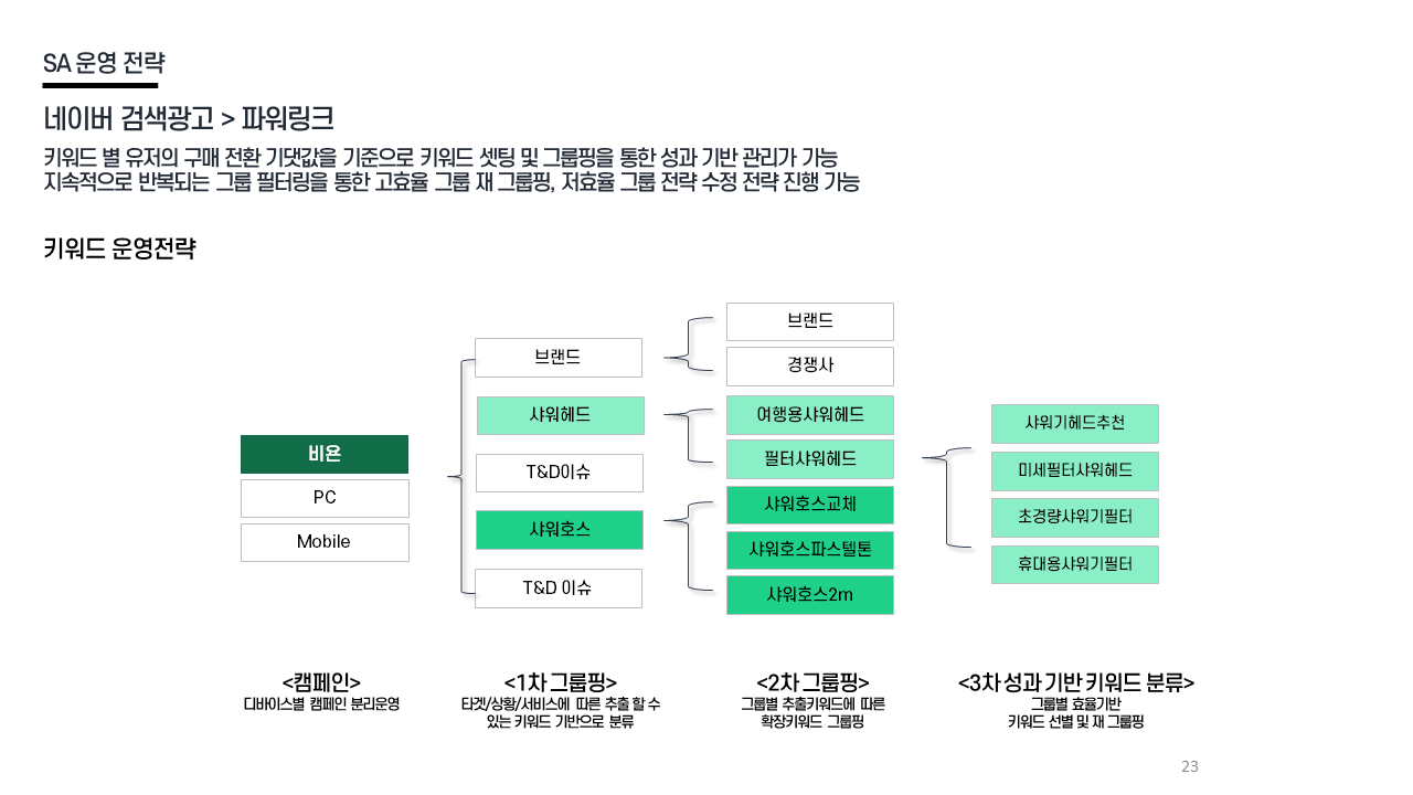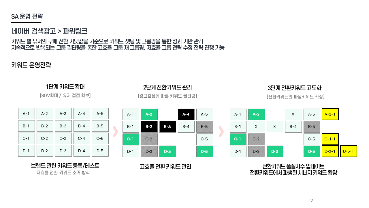 SA 전략 - 파워링크 SOV 확대 → 전환 키워드 선별 → 파생 키워드 확장 / 전환 기대값 기반 그룹 운영