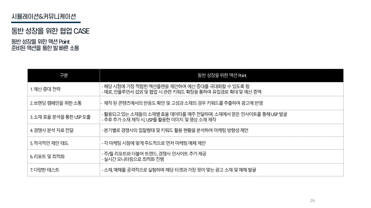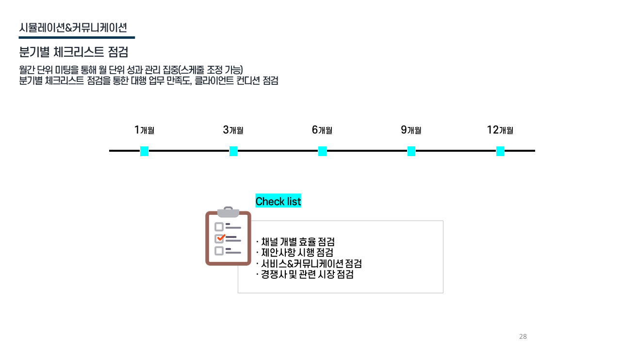 협업 체계 월간 성과 리뷰 / 분기별 체크리스트 점검 / 클라이언트 니즈 기반 빠른 커뮤니케이션