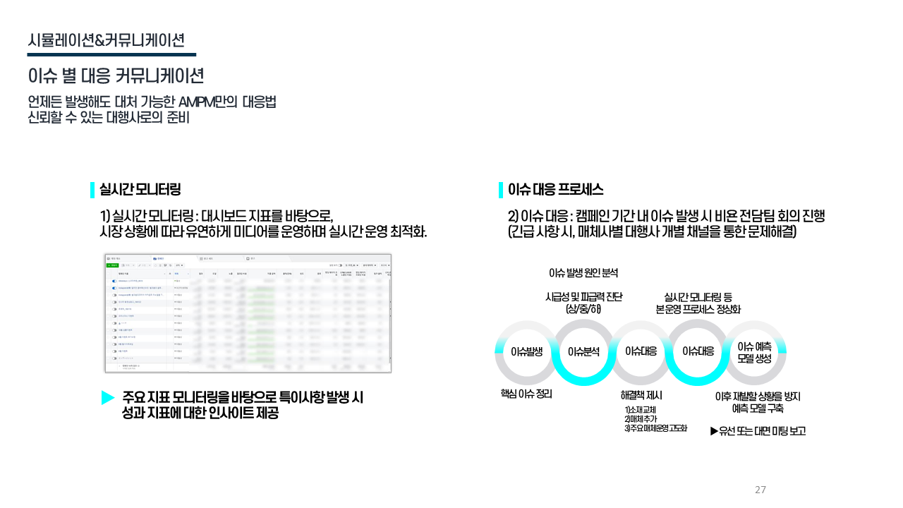 이슈 대응 실시간 모니터링 → 이슈 분석 → 해결 → 재발 방지 모델 구축 / 매체사와 즉각 조치