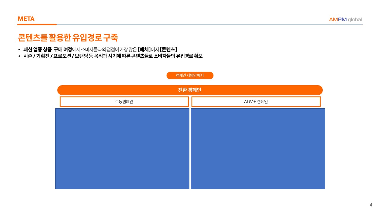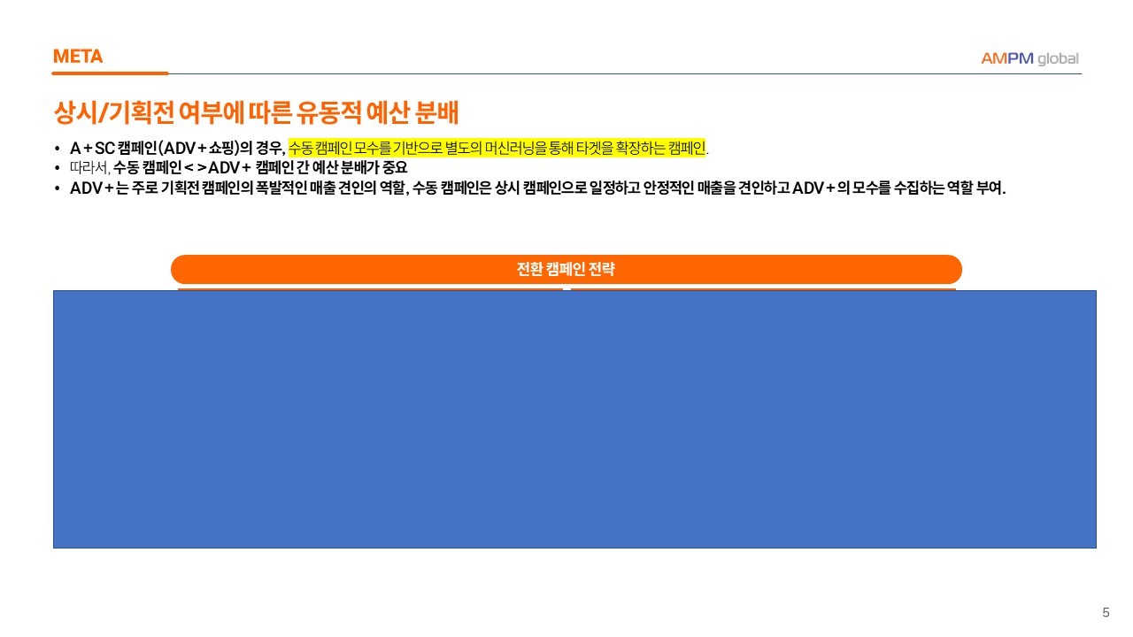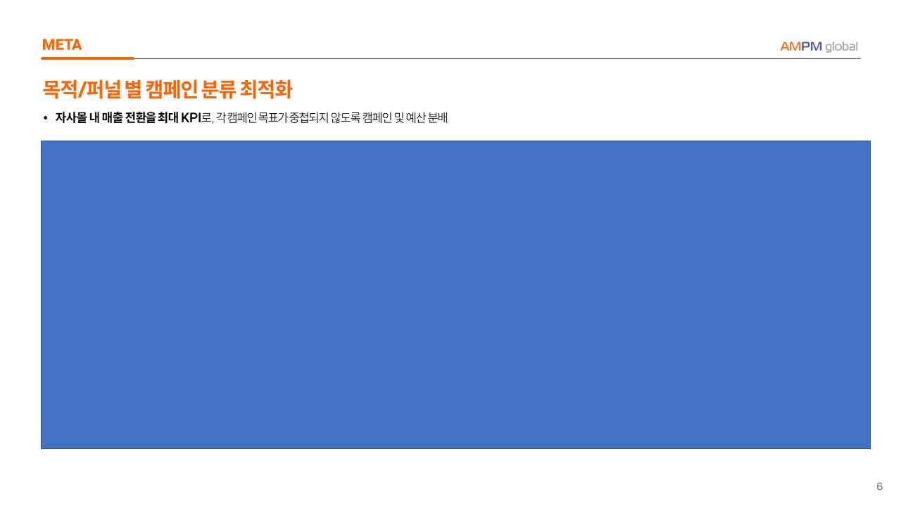--> 자사몰 내 매출 전환을 최대 KPI로, 각 캠페인 목표가 중첩되지 않도록 캠페인 및 예산 분배