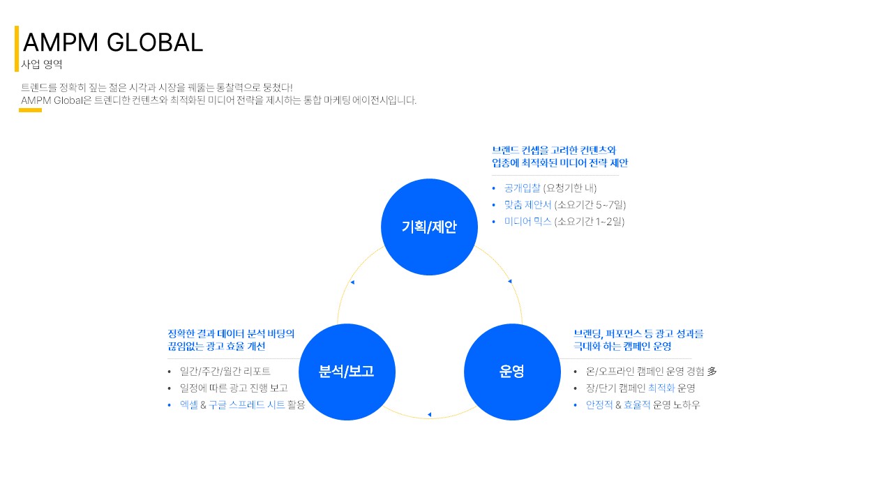 개인정보 처리방침은 개인정보보호법을 기준으로 작성하되, 에이엠피엠글로벌(AMPM global) 내에서의 이용자 개인정보 처리 현황을 최대한 알기 쉽고 상세하게 설명하기 위해 노력하였습니다.