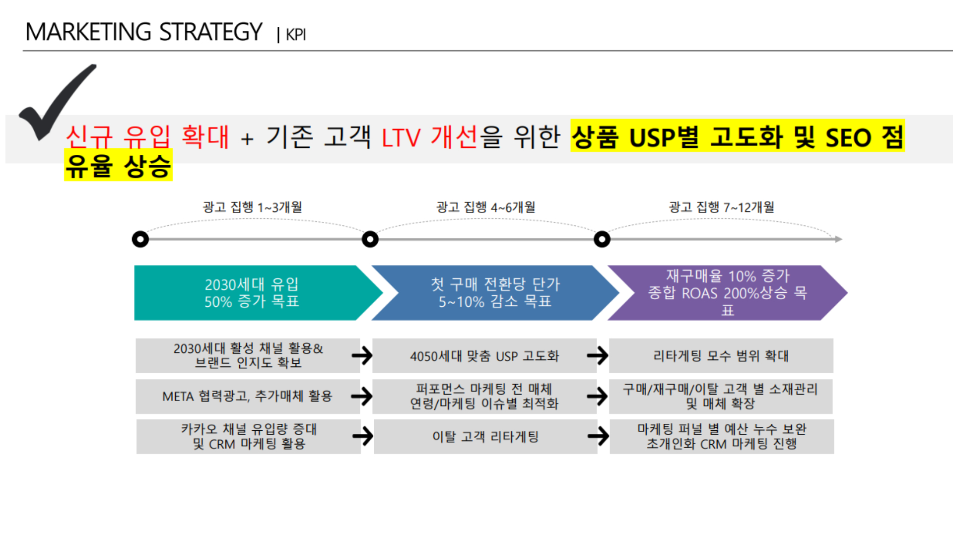 마케팅 KPI 신규 유입 확대 + 기존 고객 LTV 개선을 위한 상품 USP별 고도화 및 SEO 점유율 상승