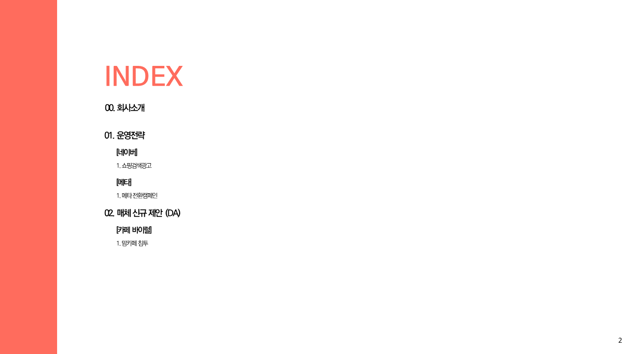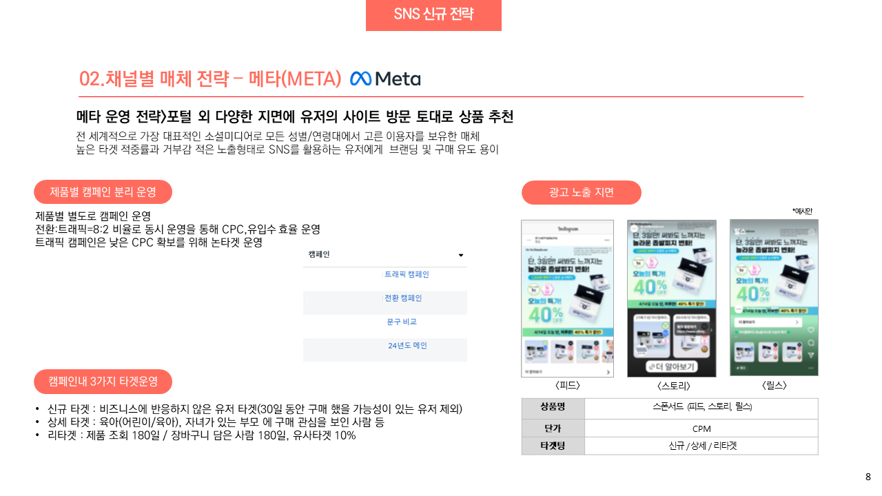 집행내용 - 메타 광고 집행: 전환율 1.8% → 2.5%로 상승, 클릭률 22% 향상, 전환당비용 27% 감소.