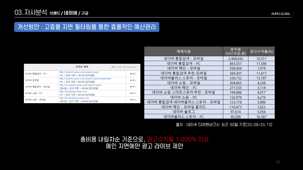 1) 네이버 검색광고 1,000 만원 2) 구글 1,000만원 3) 신규 매체 (역제안)