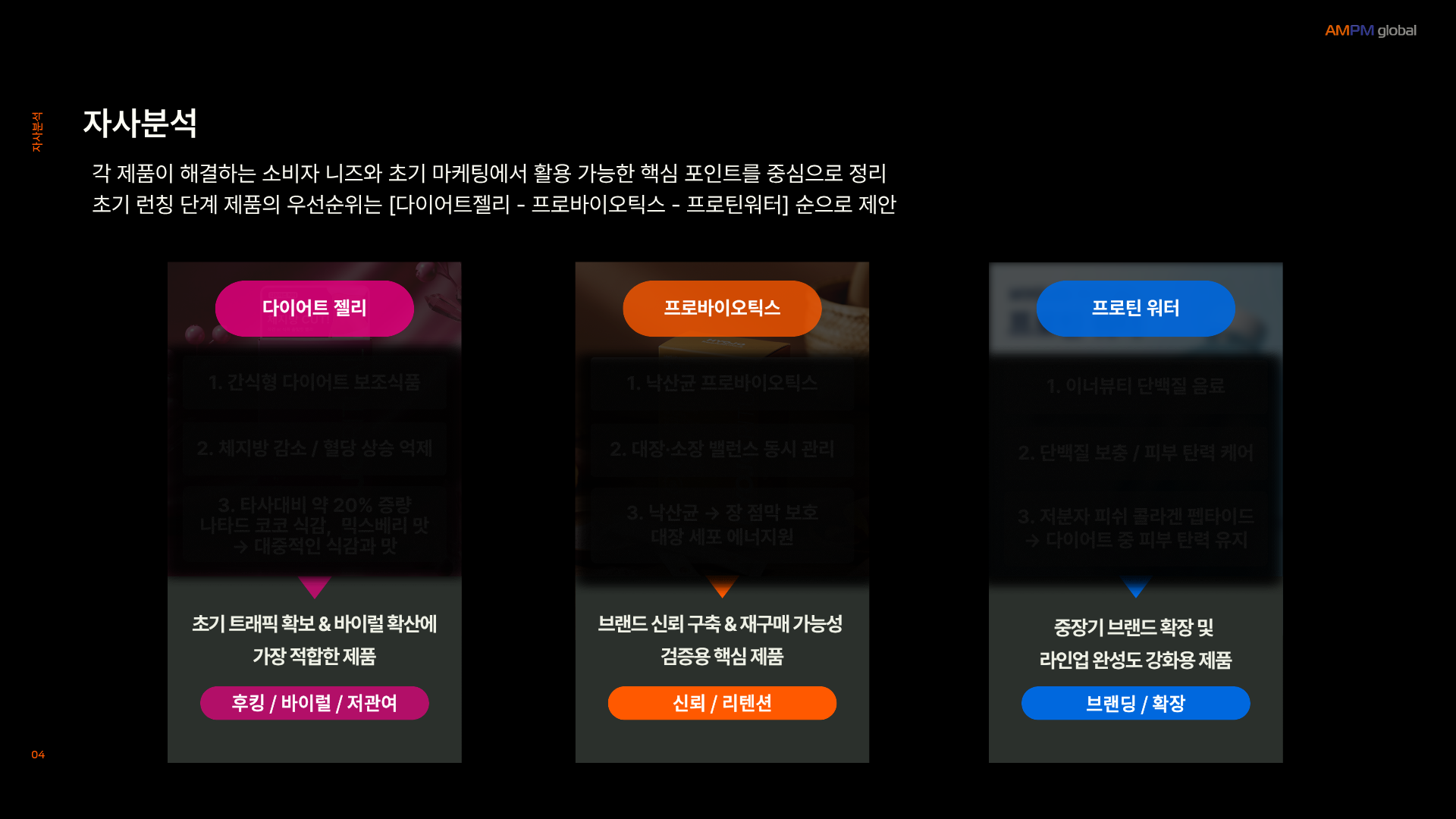 다이어트 젤리, 프로바이오틱스, 프로틴 워터 3가지 제품의 성격과 구매 여정이 서로 다르다는 점에 주목하여