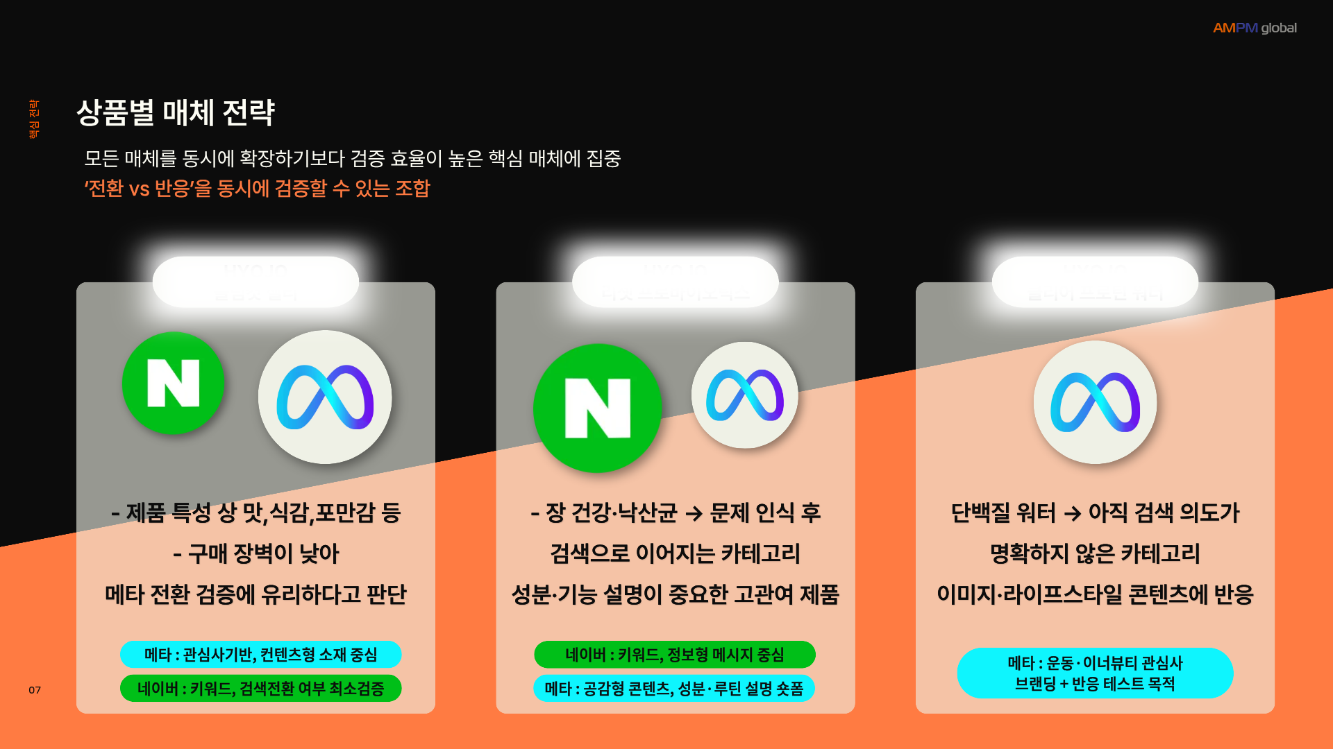 제품별 핵심 소구·타겟·매체 역할을 명확히 분리하고,