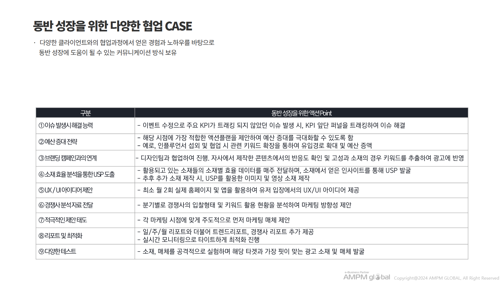 • 5. 이용자의 영상출연/PPL 신청 후 촬영이 완료된 영상은 에이엠피엠글로벌(AMPM global)의 저작물인 동시에 포트폴리오로서 에이엠피엠글로벌(AMPM global)이 소유한 웹사이트, 유튜브 채널 등에 마케팅 및 프로모션 목적으로 사용될 수 있습니다.