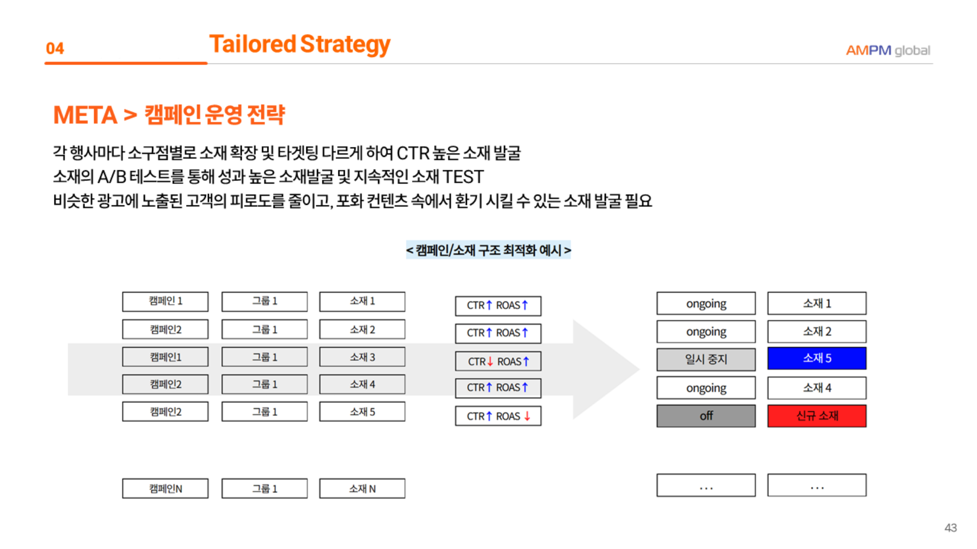 CTR·ROAS 기준 소재 A/B 테스트 지속, 고효율 소재 확대·저효율 소재 교체