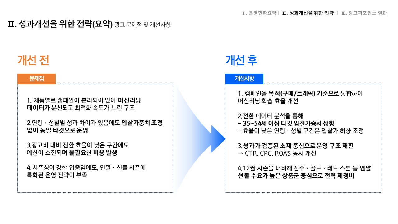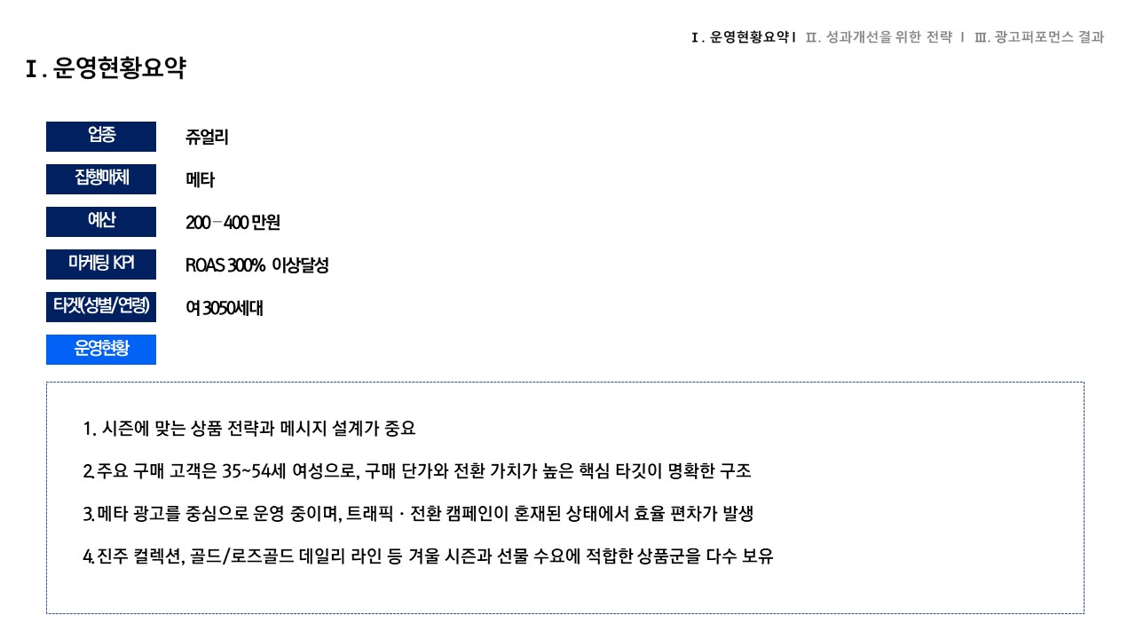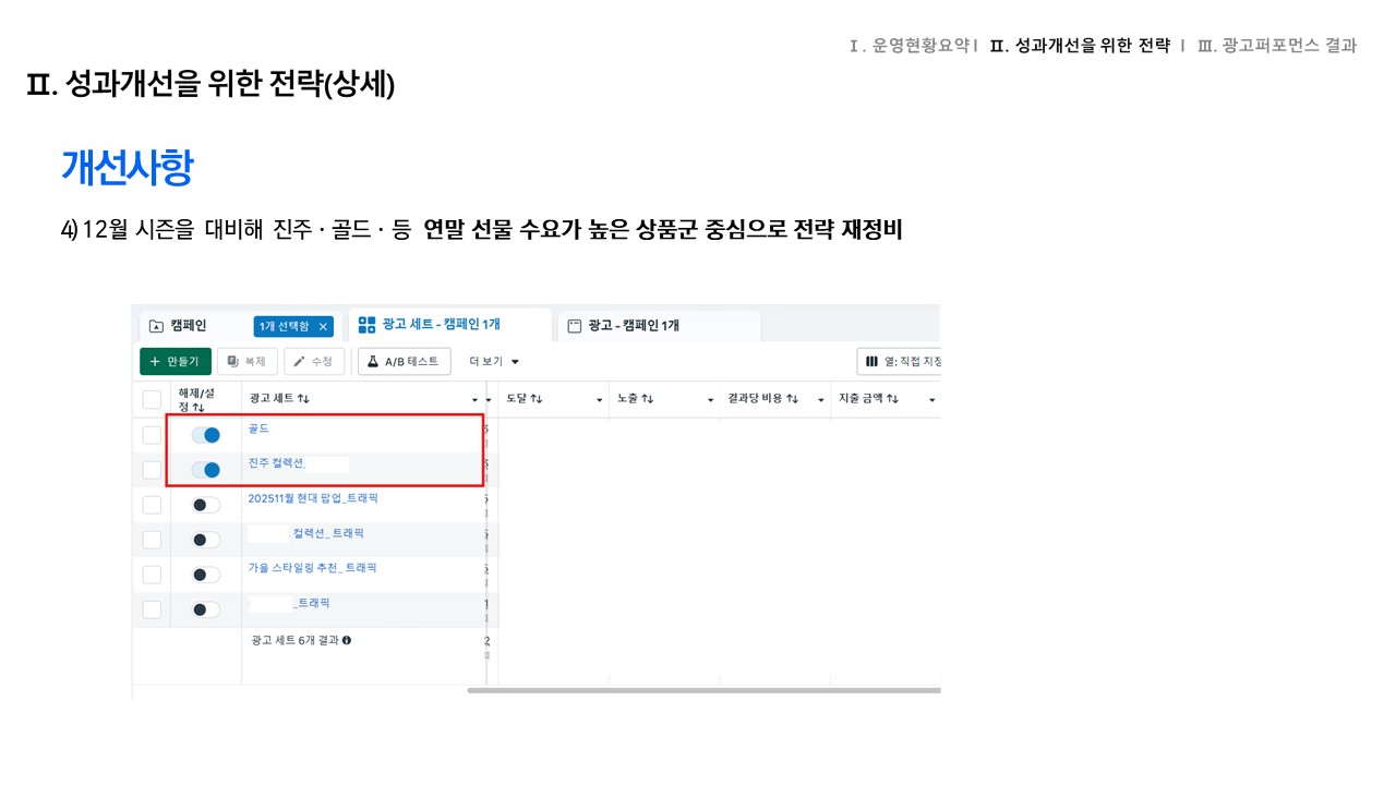 → 연말·홀리데이 시즌 구매 수요가 높은 진주, 골드·로즈골드, 레드 포인트 상품군에 예산을 집중함. 시즌에 맞는 메시지로 클릭과 전환을 동시에 강화함.