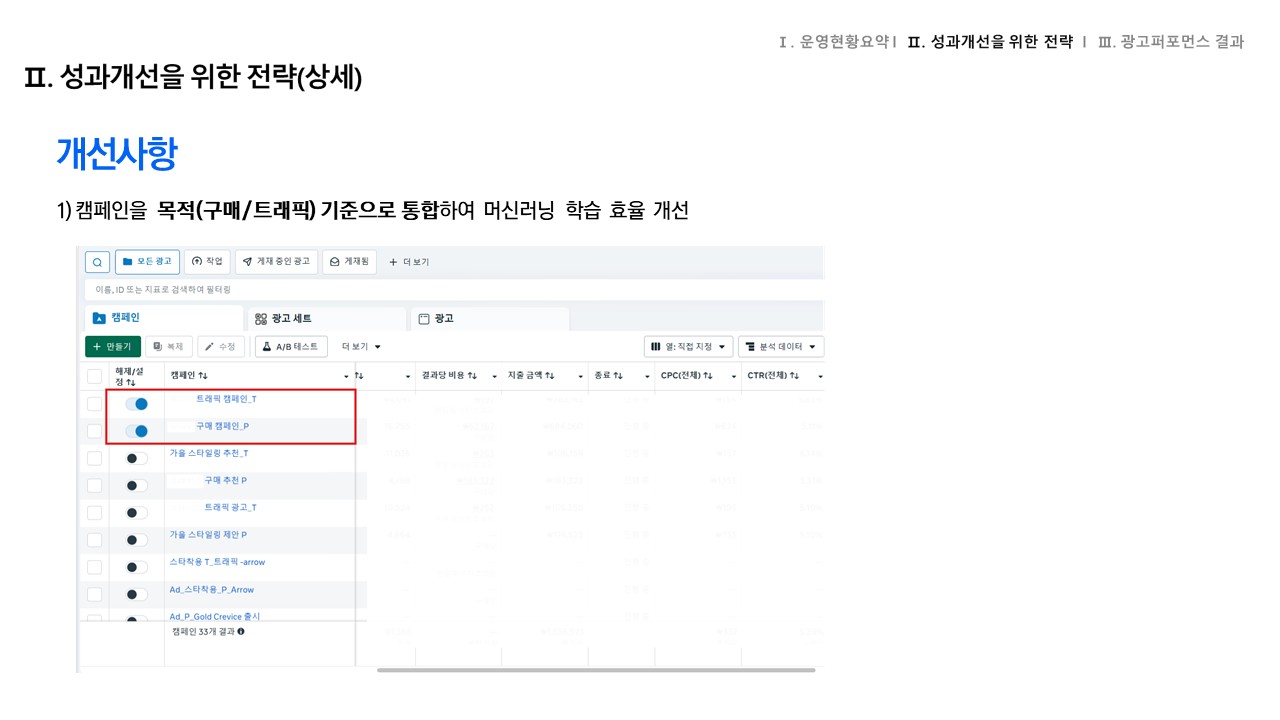 → 제품별로 분리되어 있던 캠페인을 구매·트래픽 목적 기준으로 통합함. 머신러닝 학습 데이터를 집중시켜 최적화 속도와 안정성을 동시에 확보함.