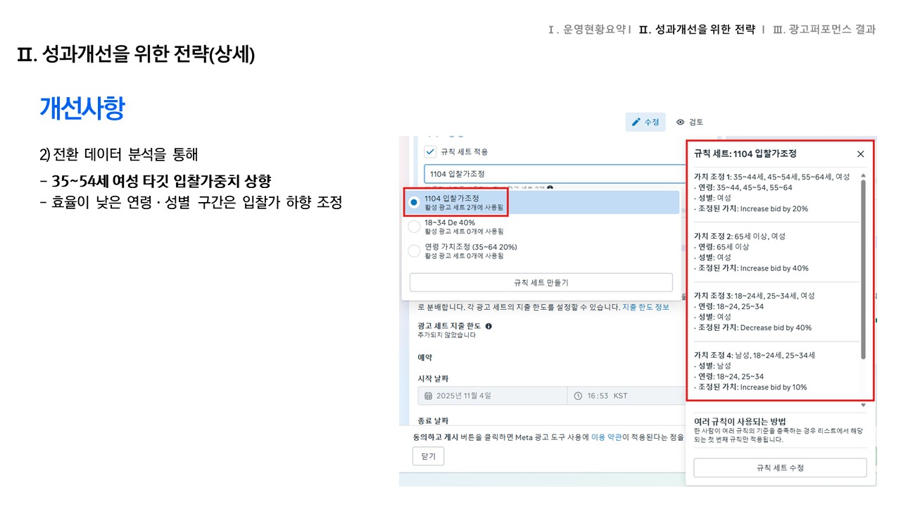 → 35~54세 여성 핵심 타깃의 입찰가중치를 상향함. 효율이 낮은 연령·성별 구간은 가중치를 낮춰 불필요한 예산 소진을 최소화함.