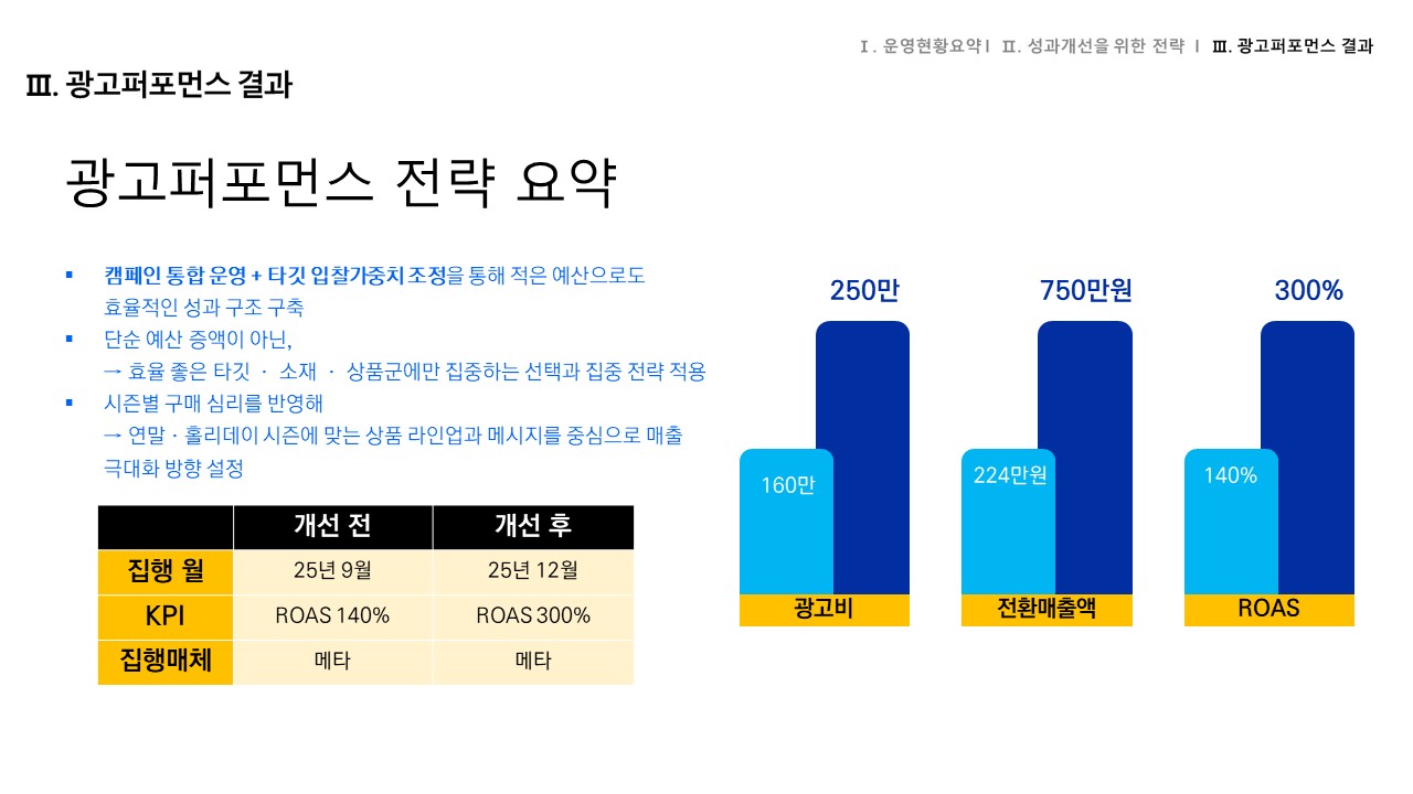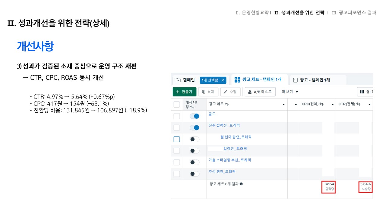 → 효율이 검증된 타깃·소재·상품군에만 집중하는 운영 방식을 적용함. 그 결과 CTR, CPC, ROAS가 동시 개선되는 구조를 구축함.