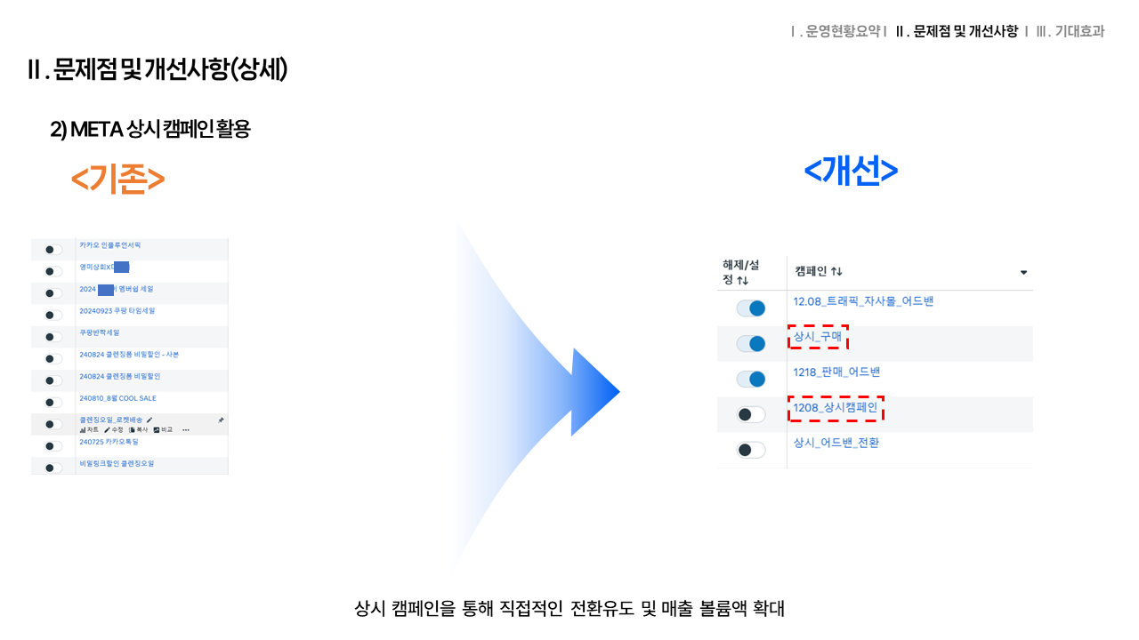 집행내용 메타 광고를 전혀 진행하고 있지 않았기 때문에 상시 캠페인을 활용하여 노출 및 유입 증대