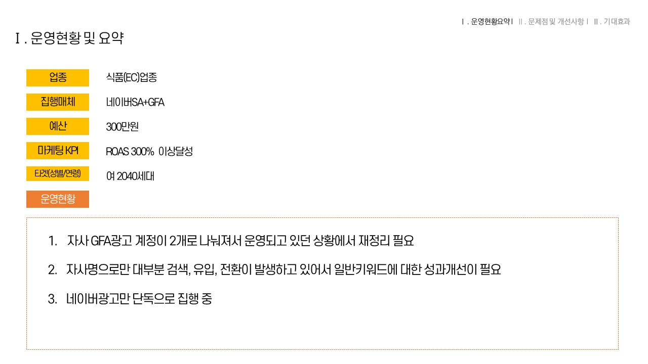 개요 네이버로만 단독운영중이나, 자사명으로만 대부분 전환이 발생하고 있어서 자사명 외의 전환이 발생할 수 있는 전략 제안