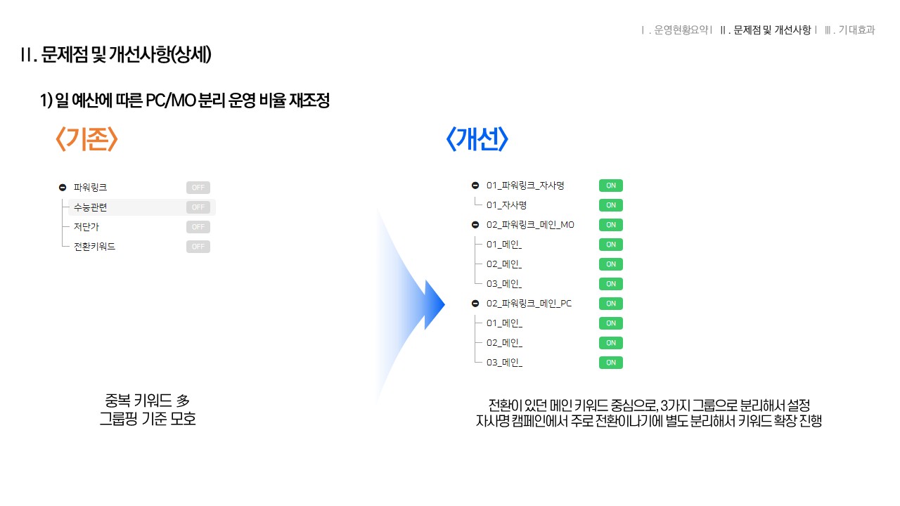 1) 단일 캠페인으만 운영하며 디바이스에 따른 PC/MO 검색량 고려하지 않고 집행중