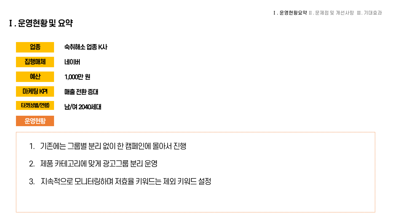 집행내용 기존 네이버 광고만 운영되고 있었으나, 제대로된 세팅이 되어있지 않았음.