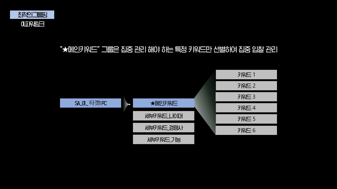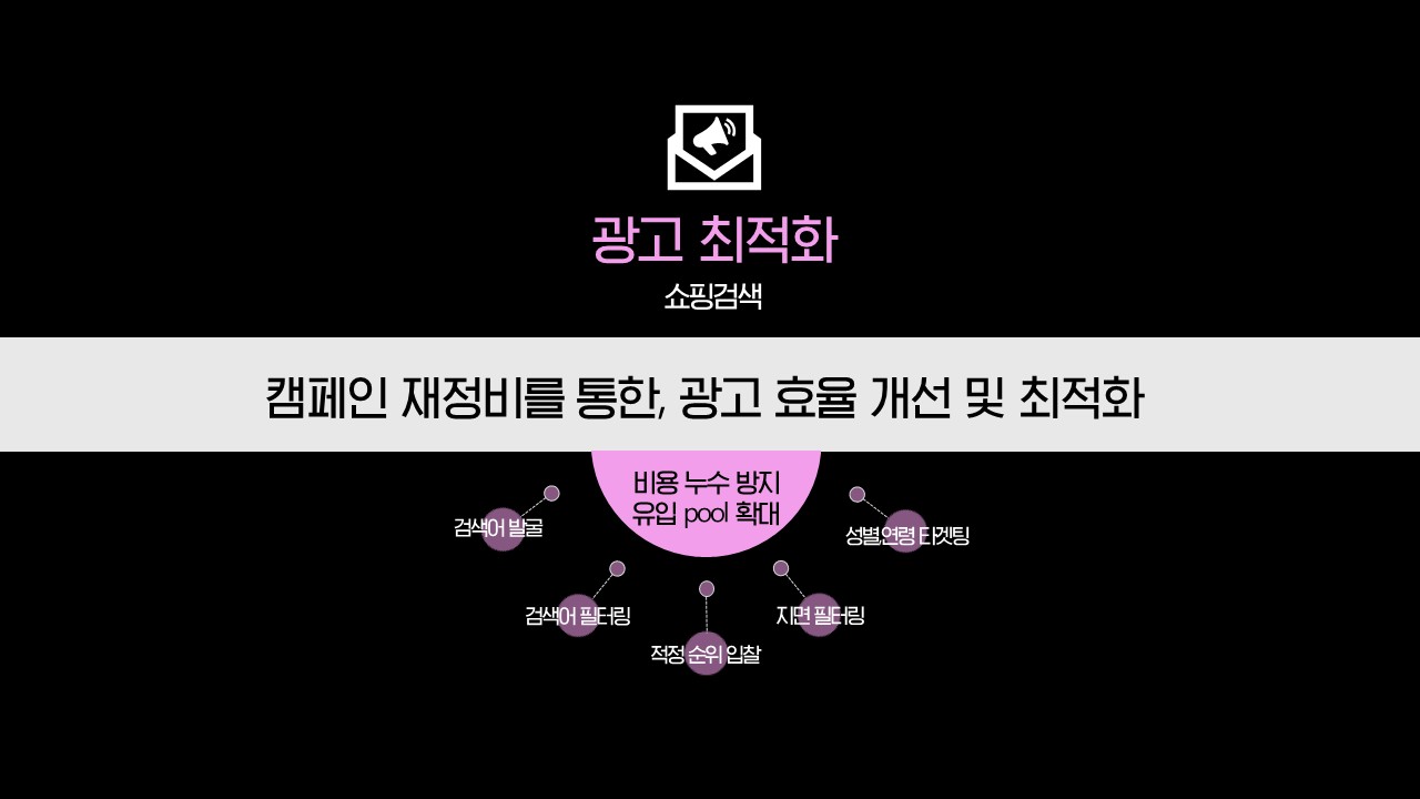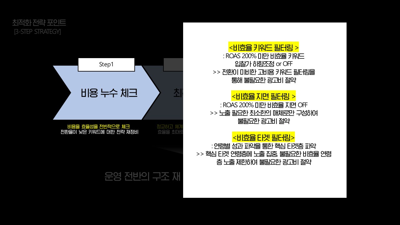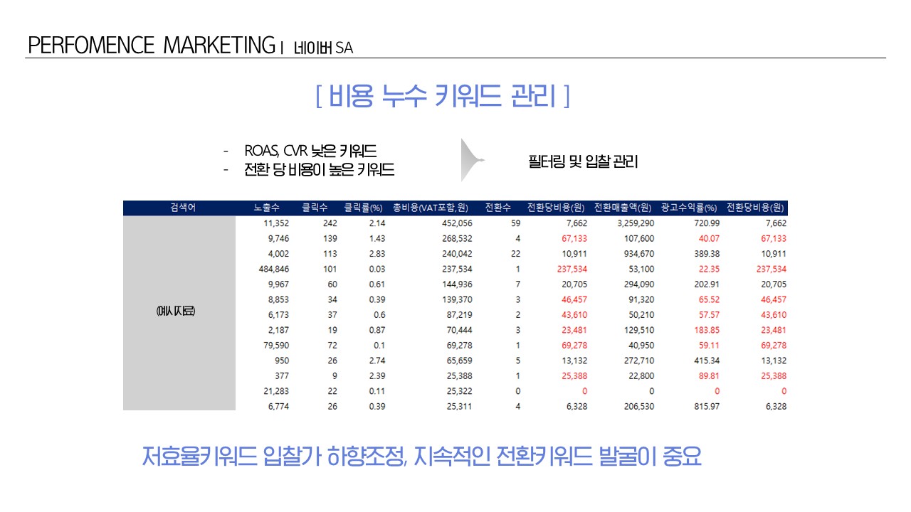 - 비용 누수 키워드 관리 >> 저효율 키워드 입찰가 하향조정, 지속적인 전환키워드 발굴