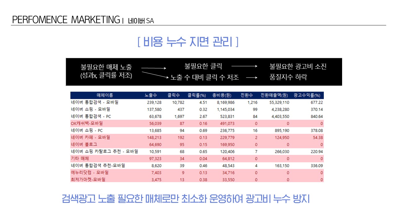 - 비용 누수 지면 관리 >> 노출 필요한 매체로만 최소화 운영하여 광고비 누수 방지