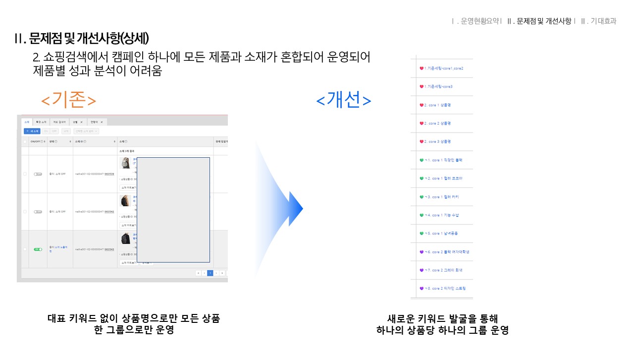 쇼핑검색에서 캠페인 하나에 모든 제품과 소재가 혼합되어 운영되어 제품별 성과 분석이 어려움