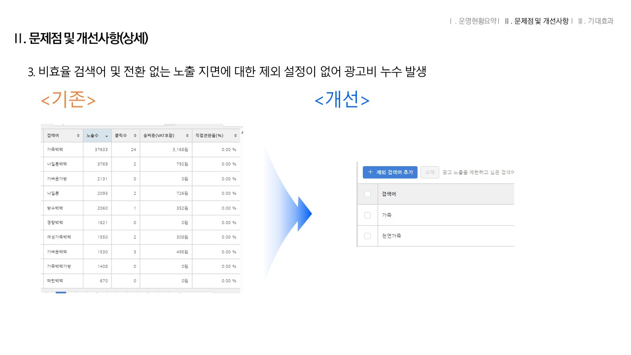 비효율 검색어 및 전환 없는 노출 지면에 대한 제외 설정이 없어 광고비 누수 발생
