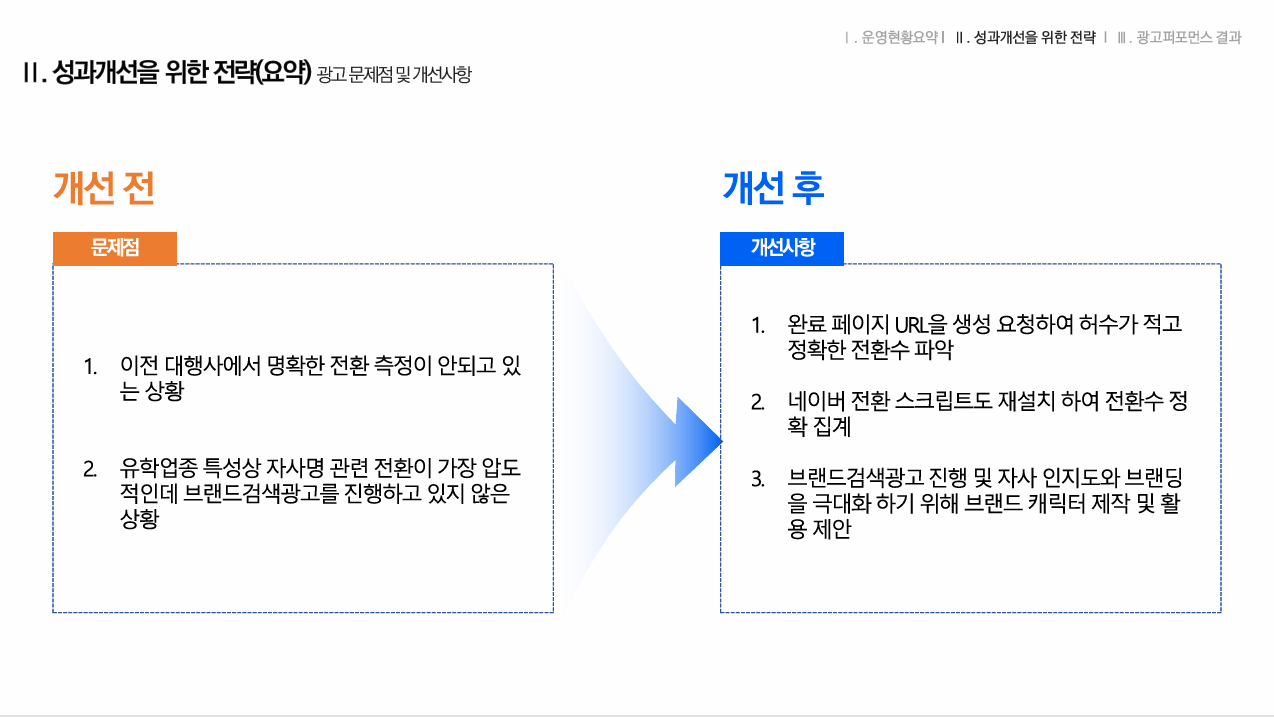 집행내용 ⭐ 이전 대행사에서 명확한 전환 측정이 되지 않고 있었으며, DB업종 특성상 허수 유입을 방지하기 위해 완료페이지 URL생성을 요청 및 네이버 전환 스크립트 재설치를 통해 전환수 정확 집계 진행