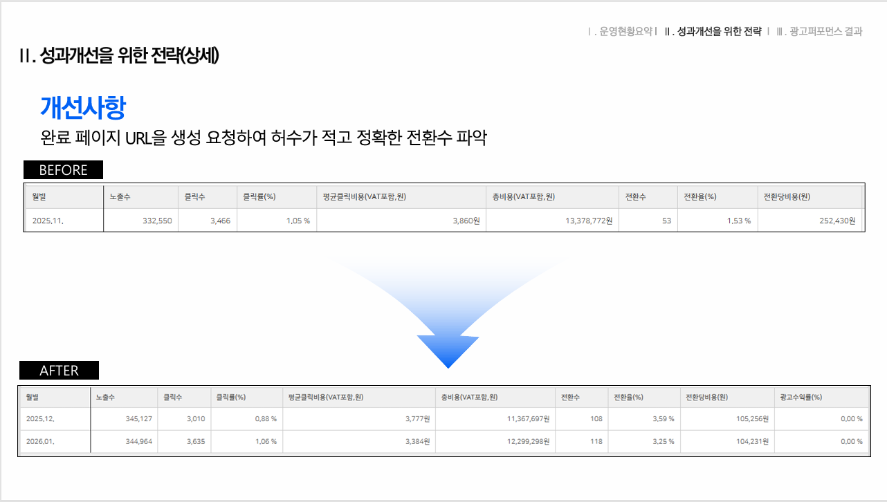 이전 대행사에서 명확한 전환 측정이 되지 않고 있었으며, DB업종 특성상 허수 유입을 방지하기 위해
