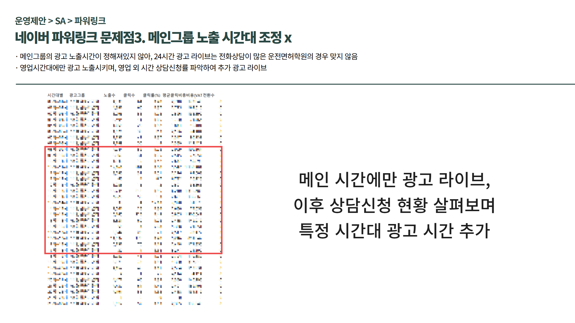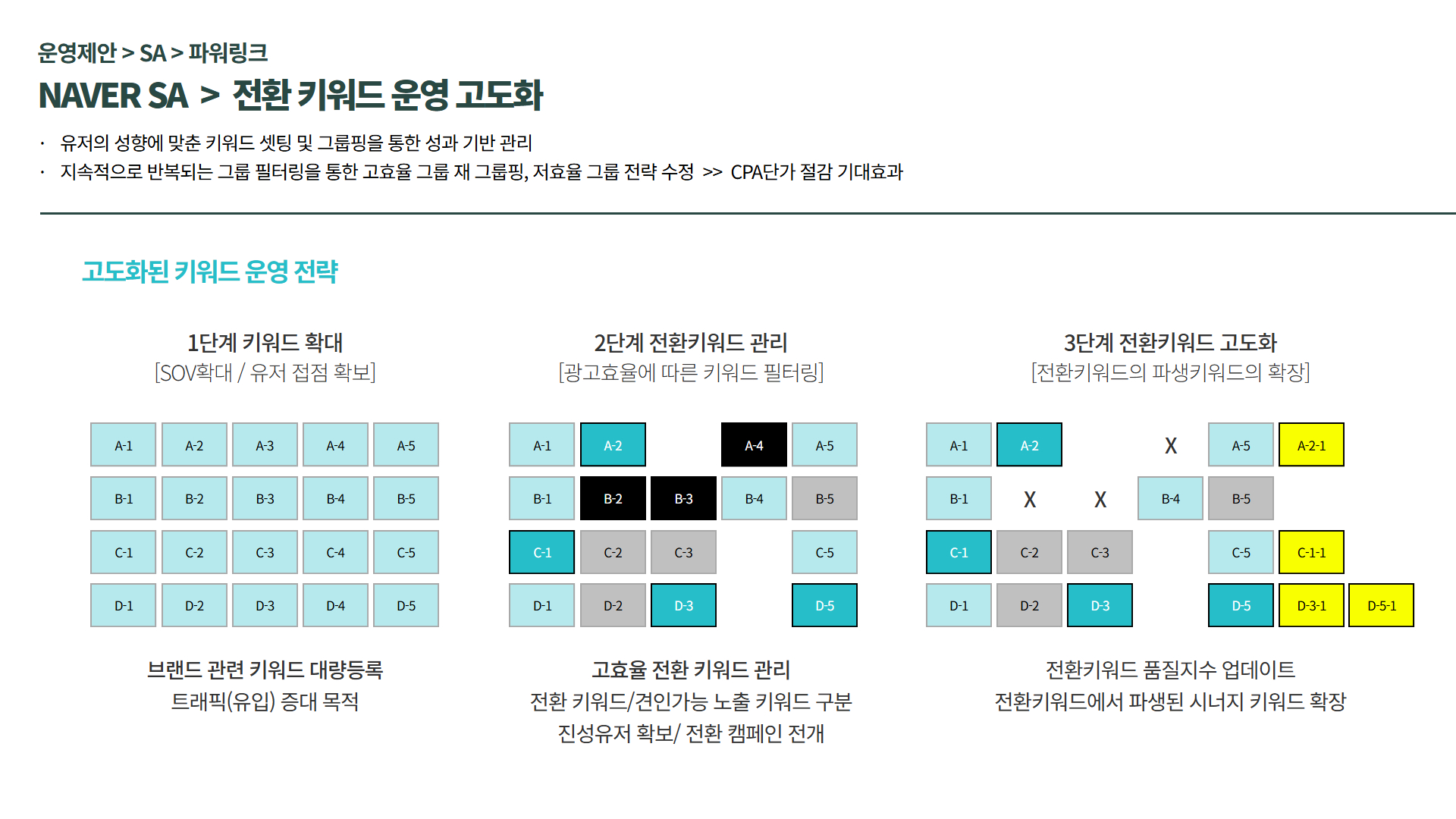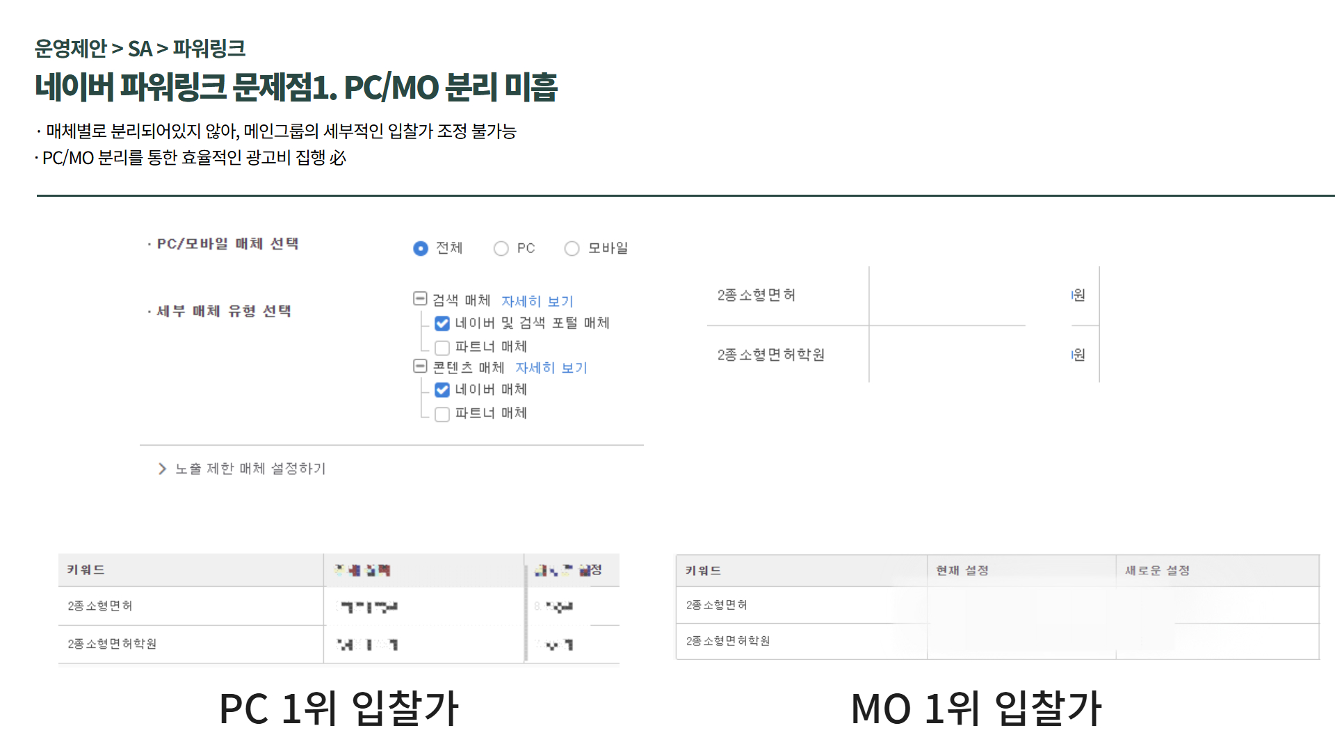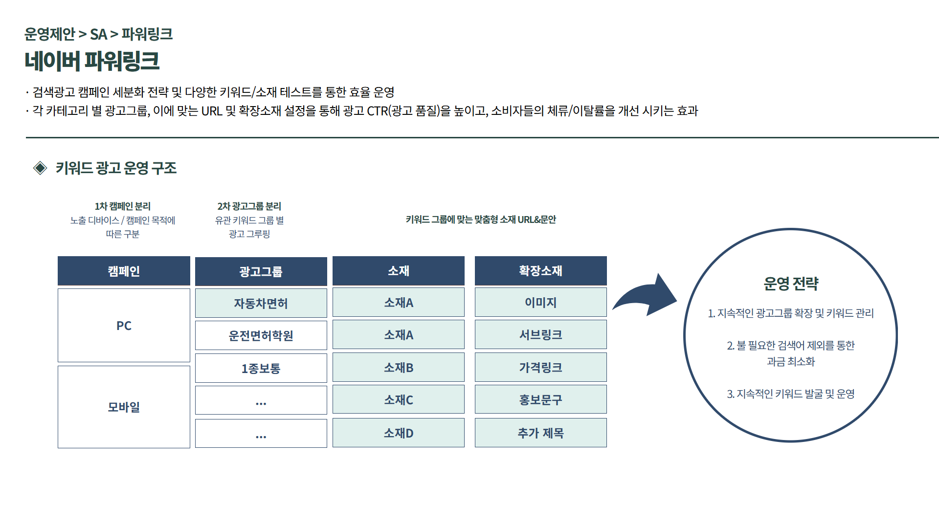 · 판매 상품/서비스별 고정 순위 유지가 아닌 전환 효율을 위한 유동적 CPC 운영 -> 주력 상품/ 주요 서비스 군 노출 최적의 CPC 발굴