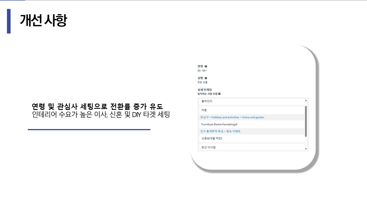 그에 따라 연령, 이사, 인테리어, 신혼등의 수요가 높은 잠재고객, 관심사 등 세팅을 진행하였으며 유사업종 소재 참고하여 소재개발 및 A/B 테스트 진행