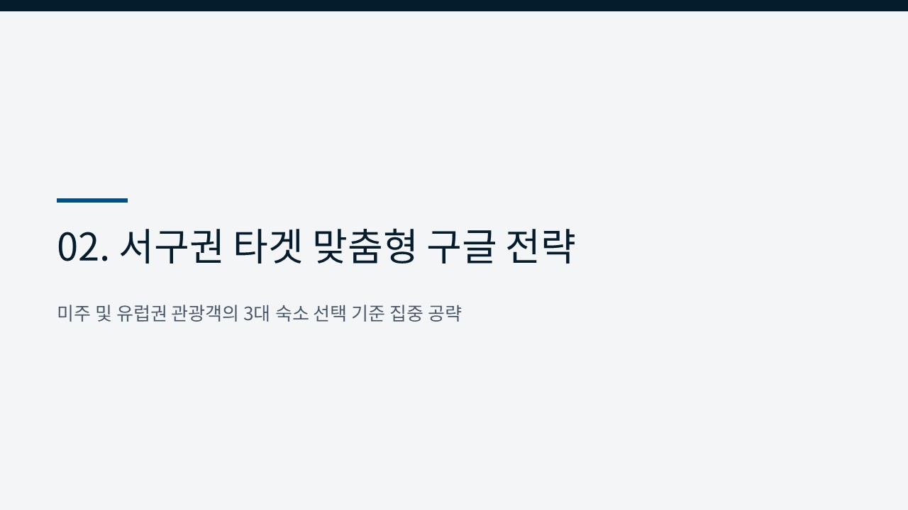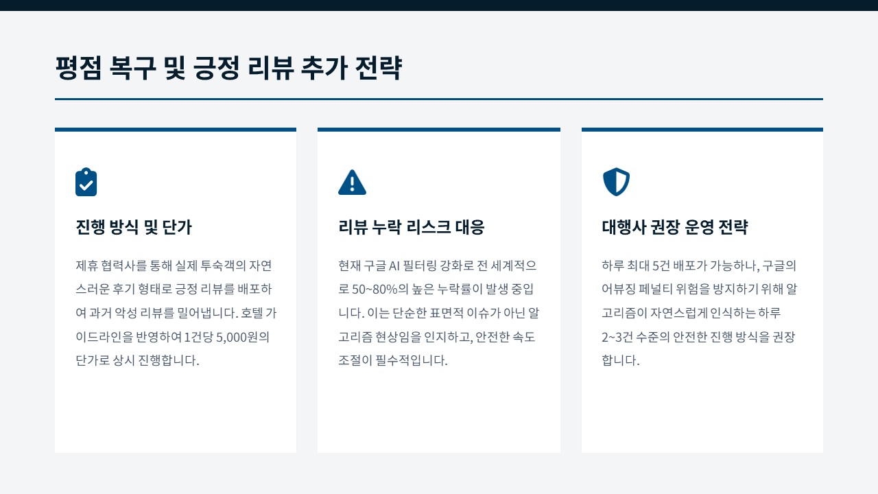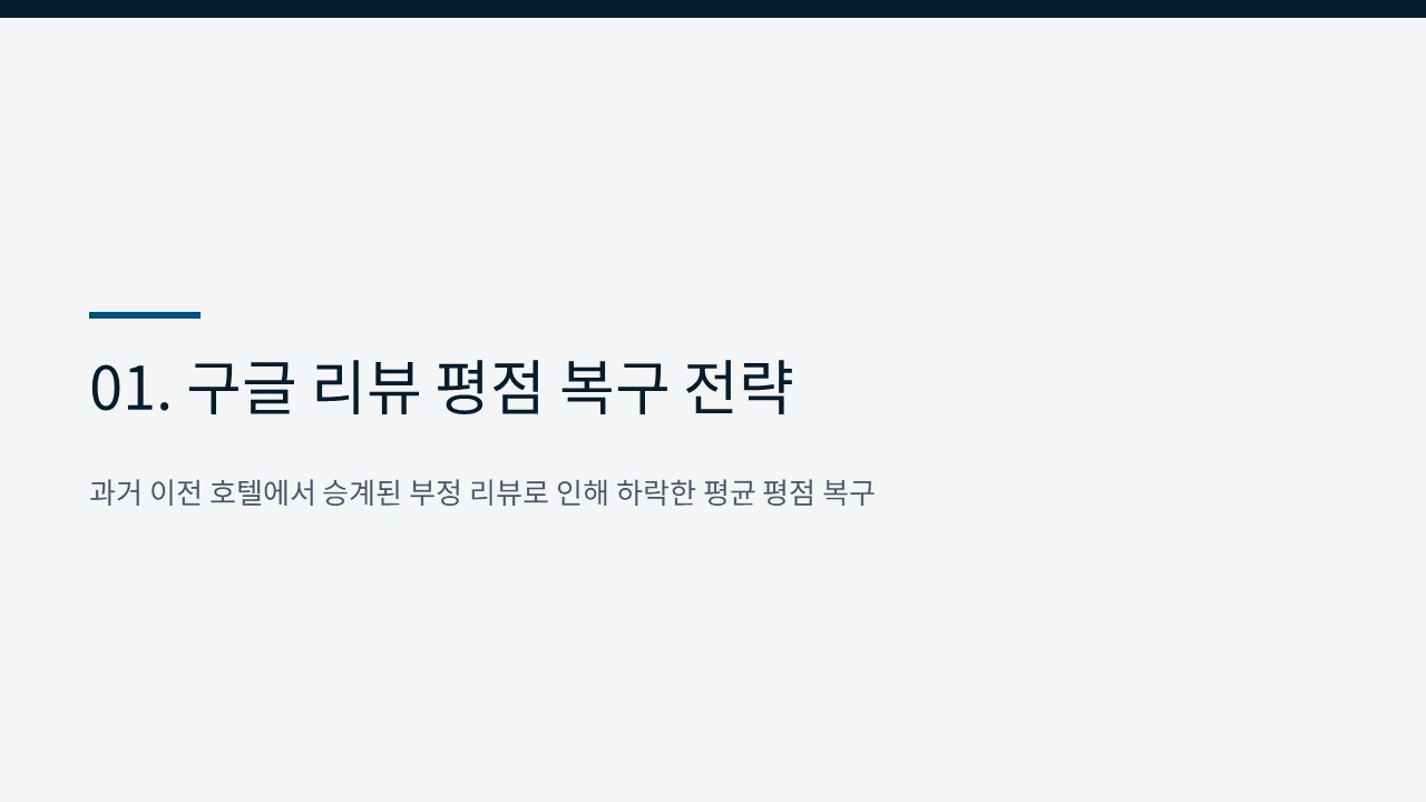 전체 성과: 구글 악성 리뷰 리스크를 선제 방어하고, 한정된 예산 내 글로벌/국내 타겟을 분리 공략하여 OTA 의존도를 낮추고 자사몰 예약(CVR)을 극대화함.