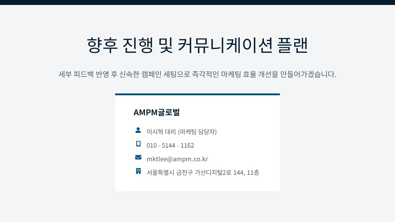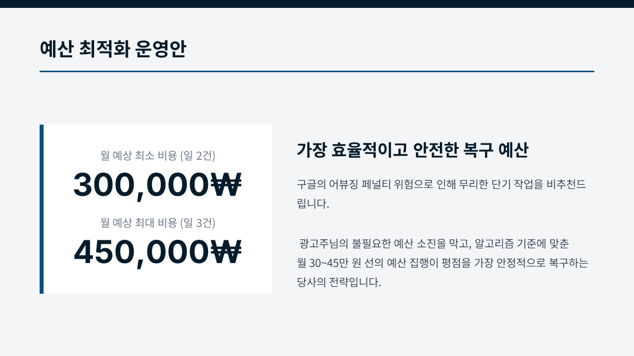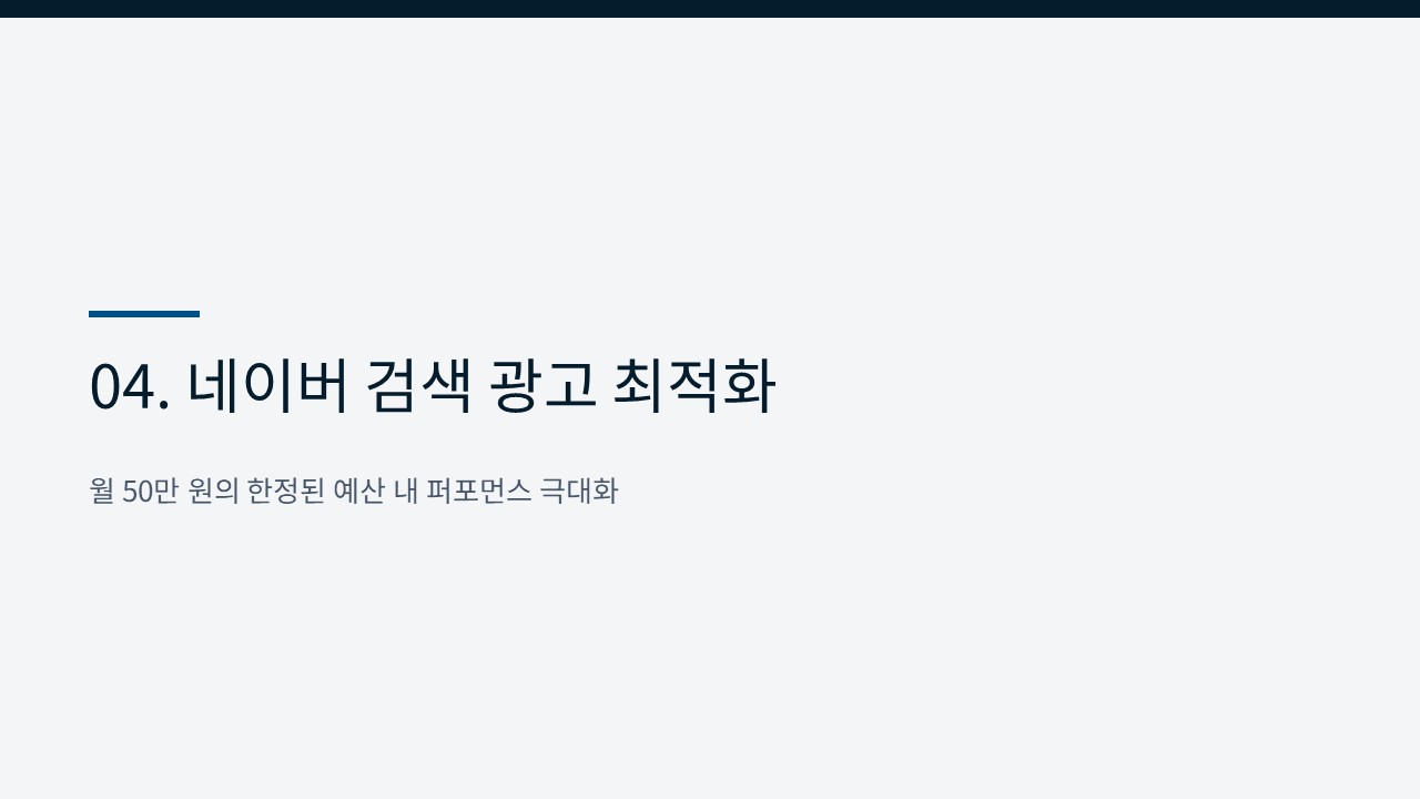 매체 최적화 (컨설팅): 비효율 특수 매체 세팅을 방어하고, 효율이 검증된 핵심 매체에 예산을 집중시켜 예산 누수율 0% 달성.