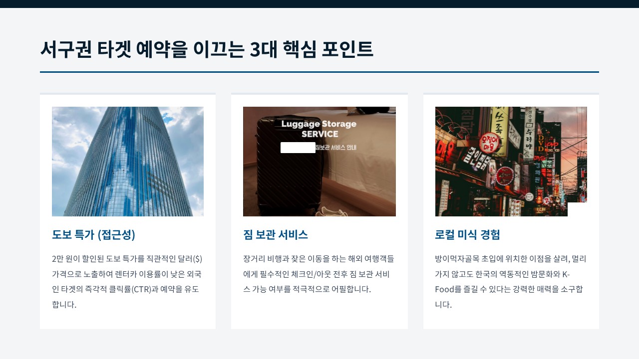 구글 검색 (글로벌): 광범위 키워드를 배제하고 '랜드마크+수하물 보관' 등 서구권 관광객의 실수요를 찌르는 고관여 롱테일 키워드 선점으로 유입 단가 절감.
