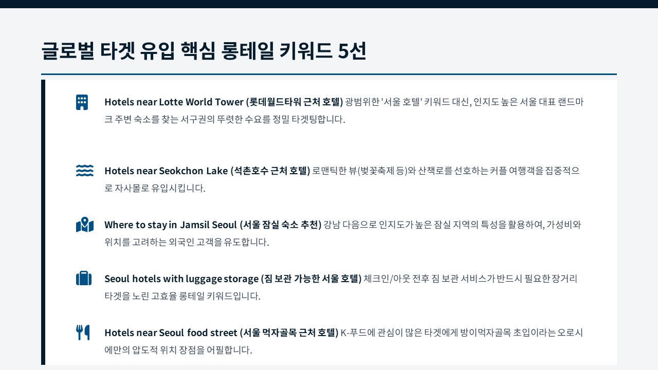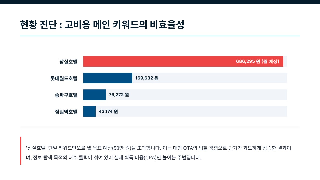 네이버 파워링크 (국내): 월 50만 원의 예산 한계 극복을 위해 고비용 메인 키워드('잠실호텔')를 배제하고, '도보 특가' 등 고효율 세부 키워드 집중 운영으로 획득 비용(CPA) 혁신.