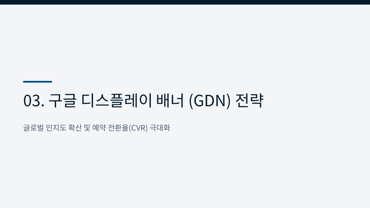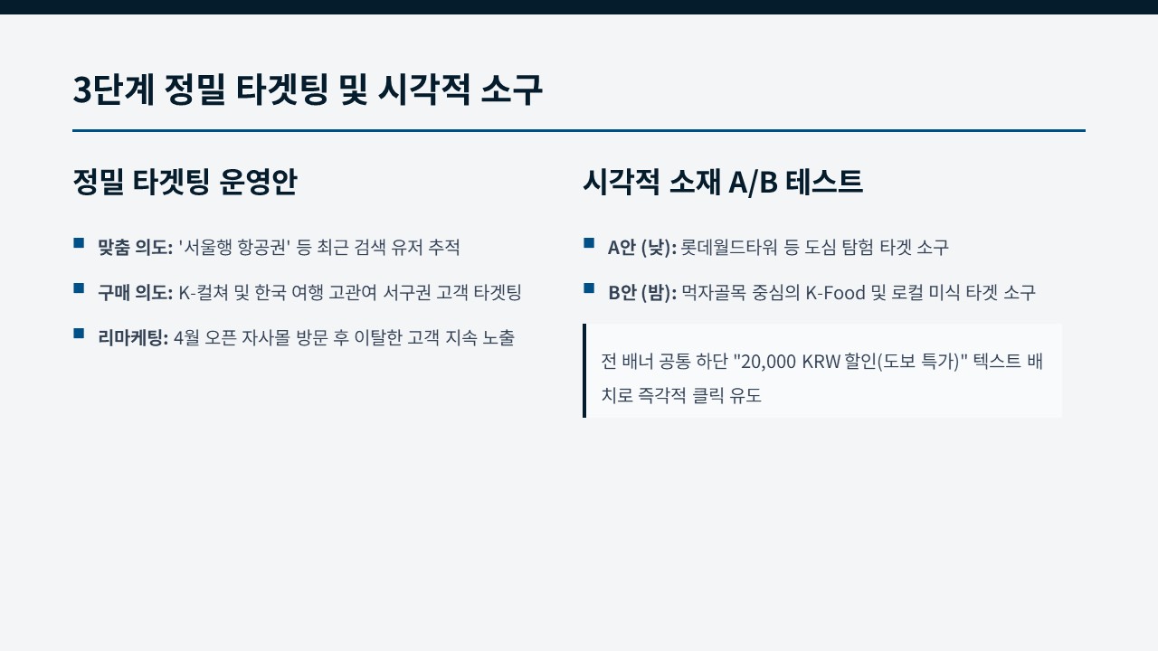 구글 GDN (글로벌): '낮(K-도심 탐험) vs 밤(K-로컬 미식)' 콘셉트의 A/B 테스트 및 이탈 고객 리마케팅으로 초기 인지도와 전환율 동시 견인.