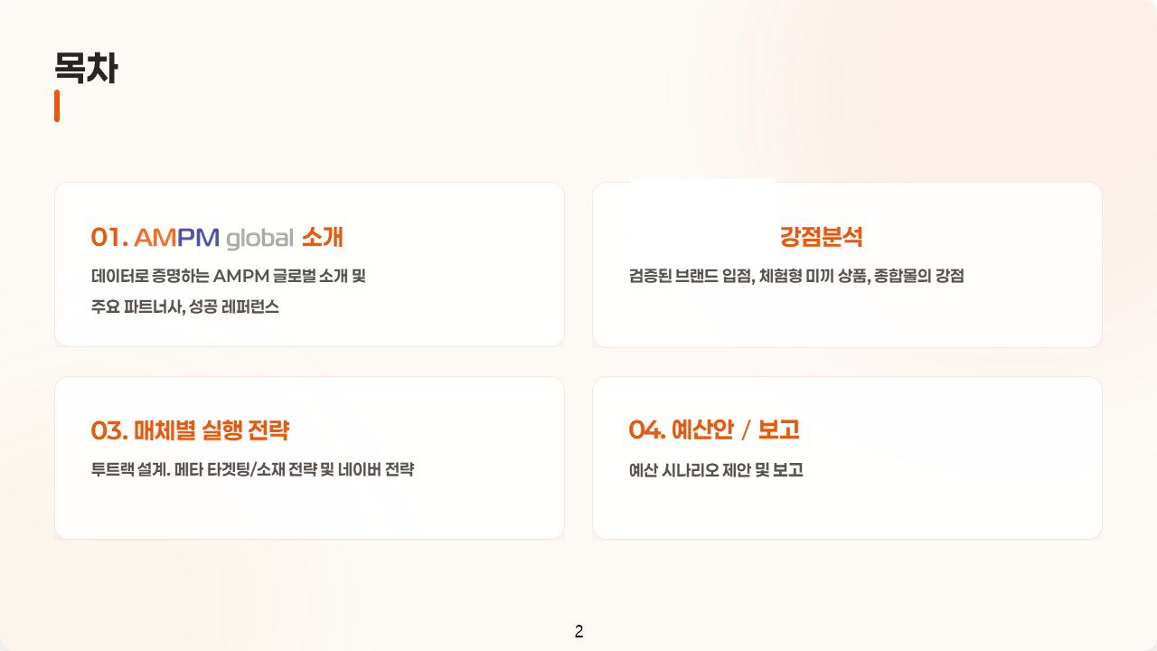 개인정보 처리방침은 개인정보보호법을 기준으로 작성하되, 에이엠피엠글로벌(AMPM global) 내에서의 이용자 개인정보 처리 현황을 최대한 알기 쉽고 상세하게 설명하기 위해 노력하였습니다.